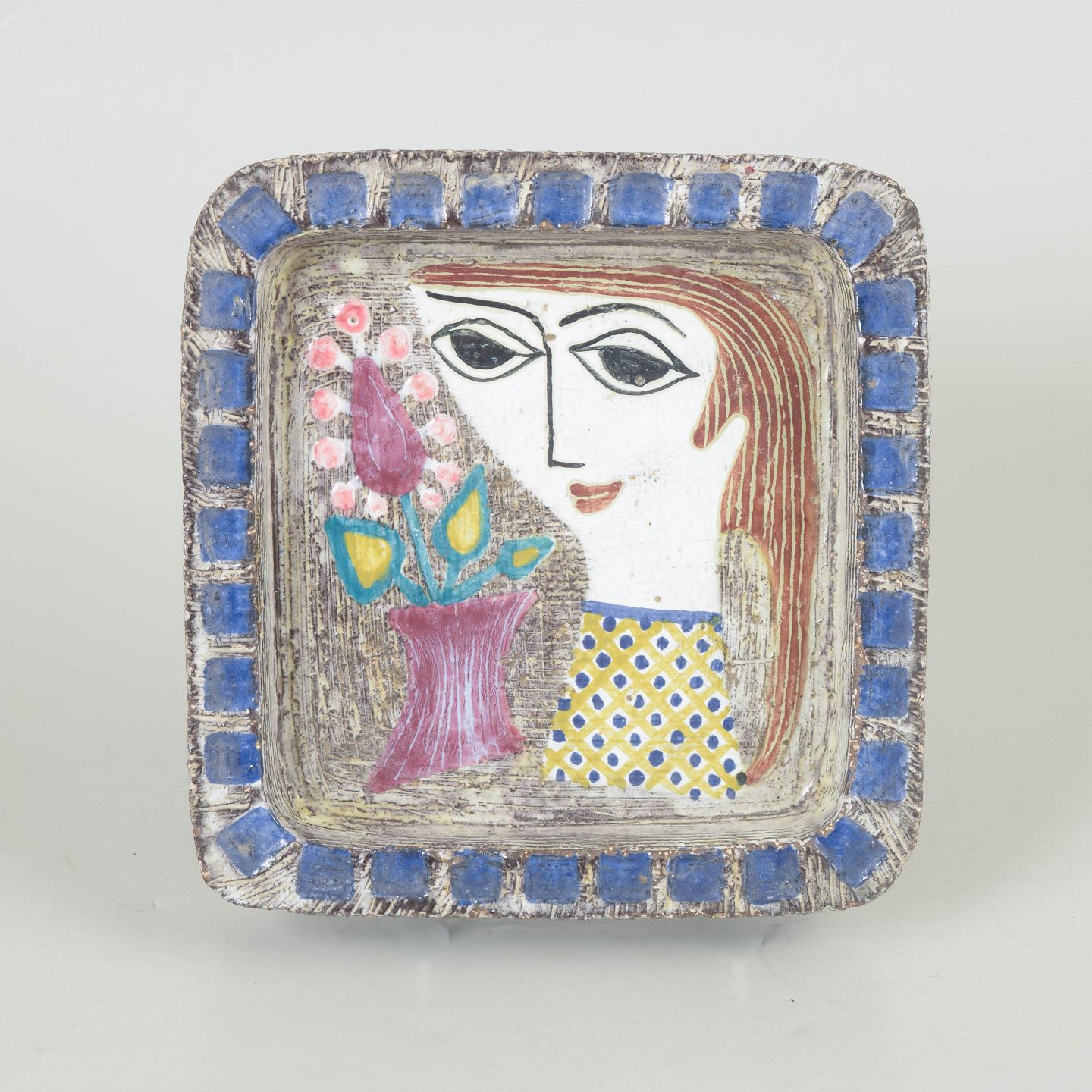 Kvadratisk keramikfad model 4156 med hånddekoreret motiv af stiliseret kvindeportræt og blomster i farverige nuancer, udført i glaseret lertøj.