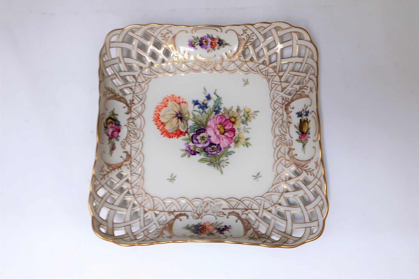 Royal Copenhagen. Saksisk blomst. Firkantet kagefad med gennembrudt kant. Længde 22 cm. ( 2 sortering )