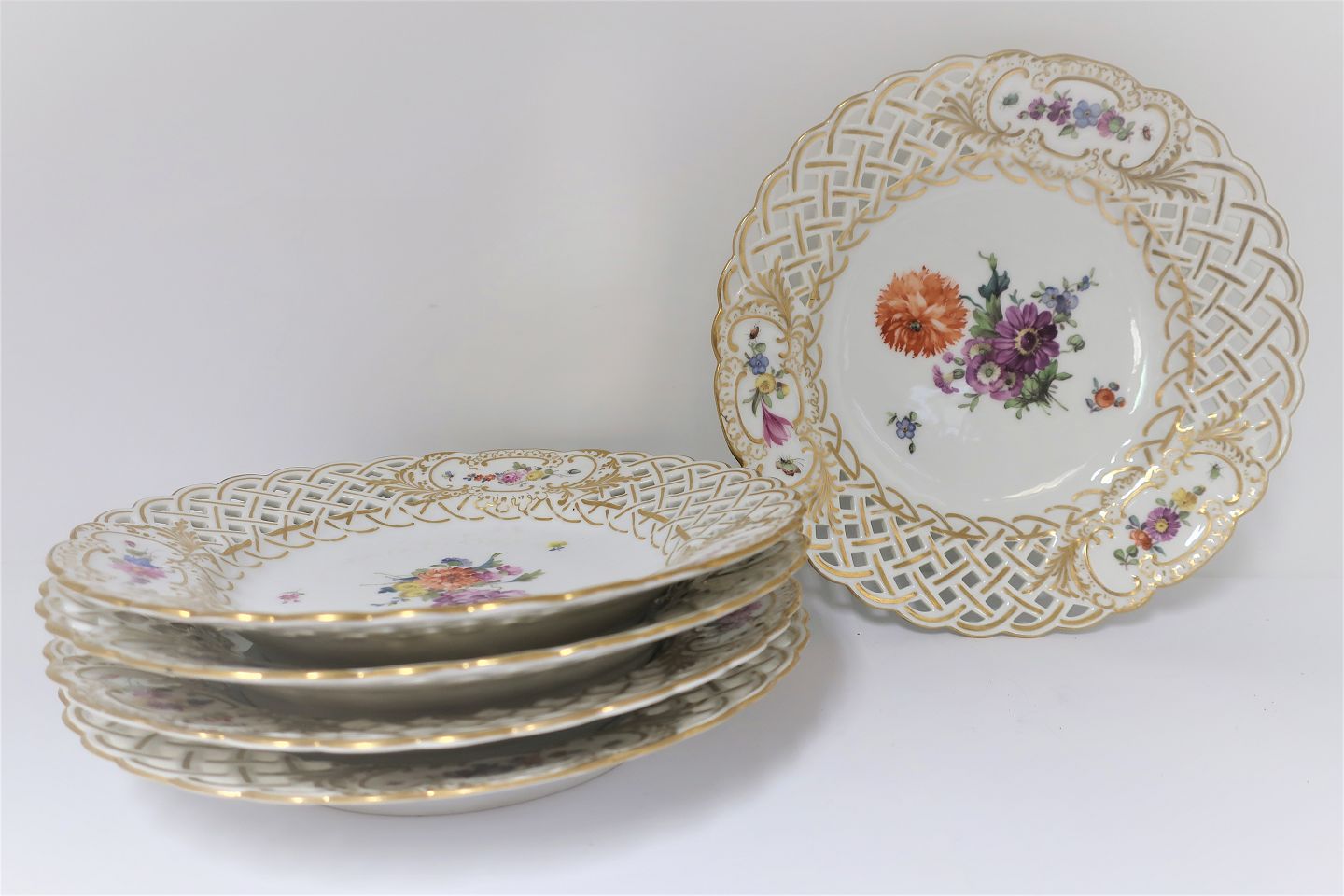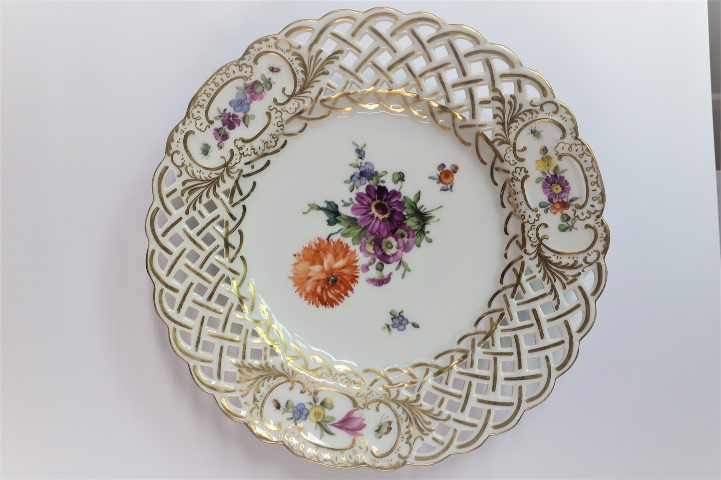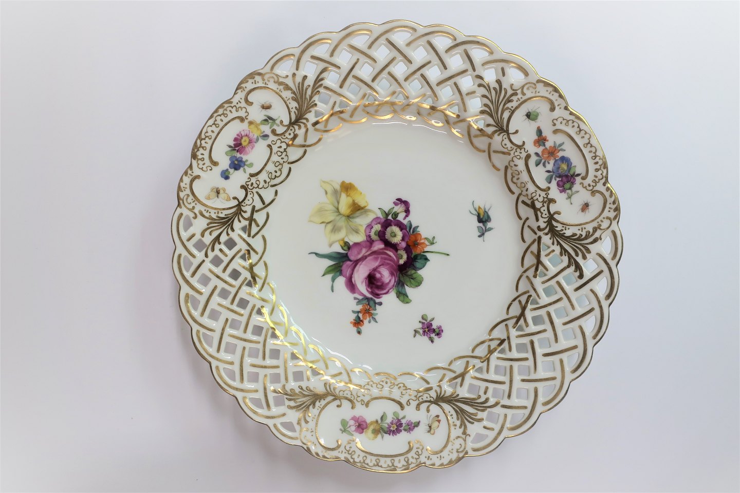 Royal Copenhagen. Sächsische Blume. Teller mit durch-brochener Kante. Modell 4-1637. Durchmesser 21 cm. 5 verschiedene Motive. Vor 1890 hergestellt. (1 Wahl)