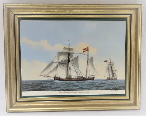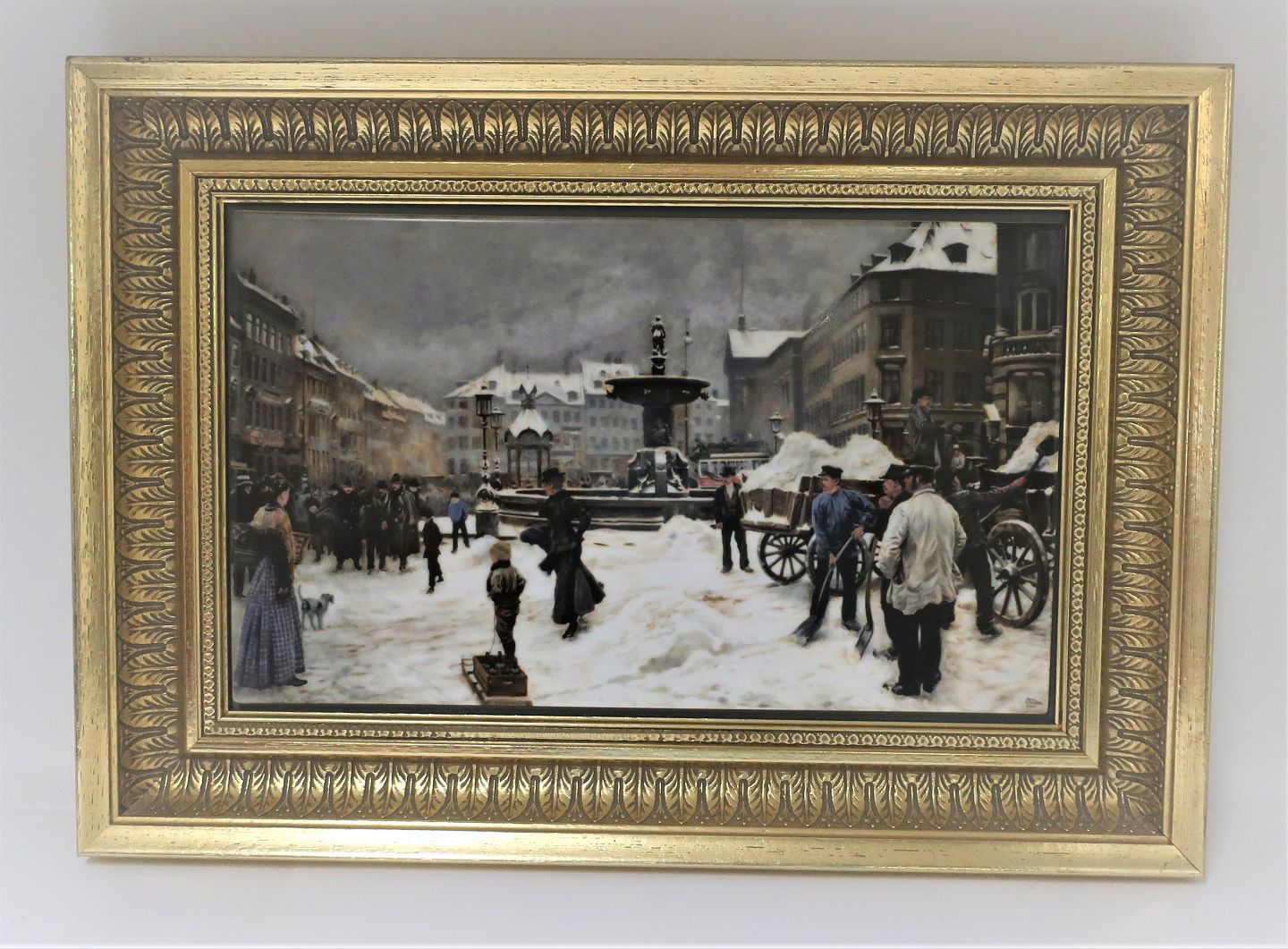 Bing & Grondahl. Porcelain painting. Motif by Paul Fischer. Winter day at Gammeltorv. Size inclusive frame, 47 * 33 cm. Produced 1750 pieces. This has number 406.