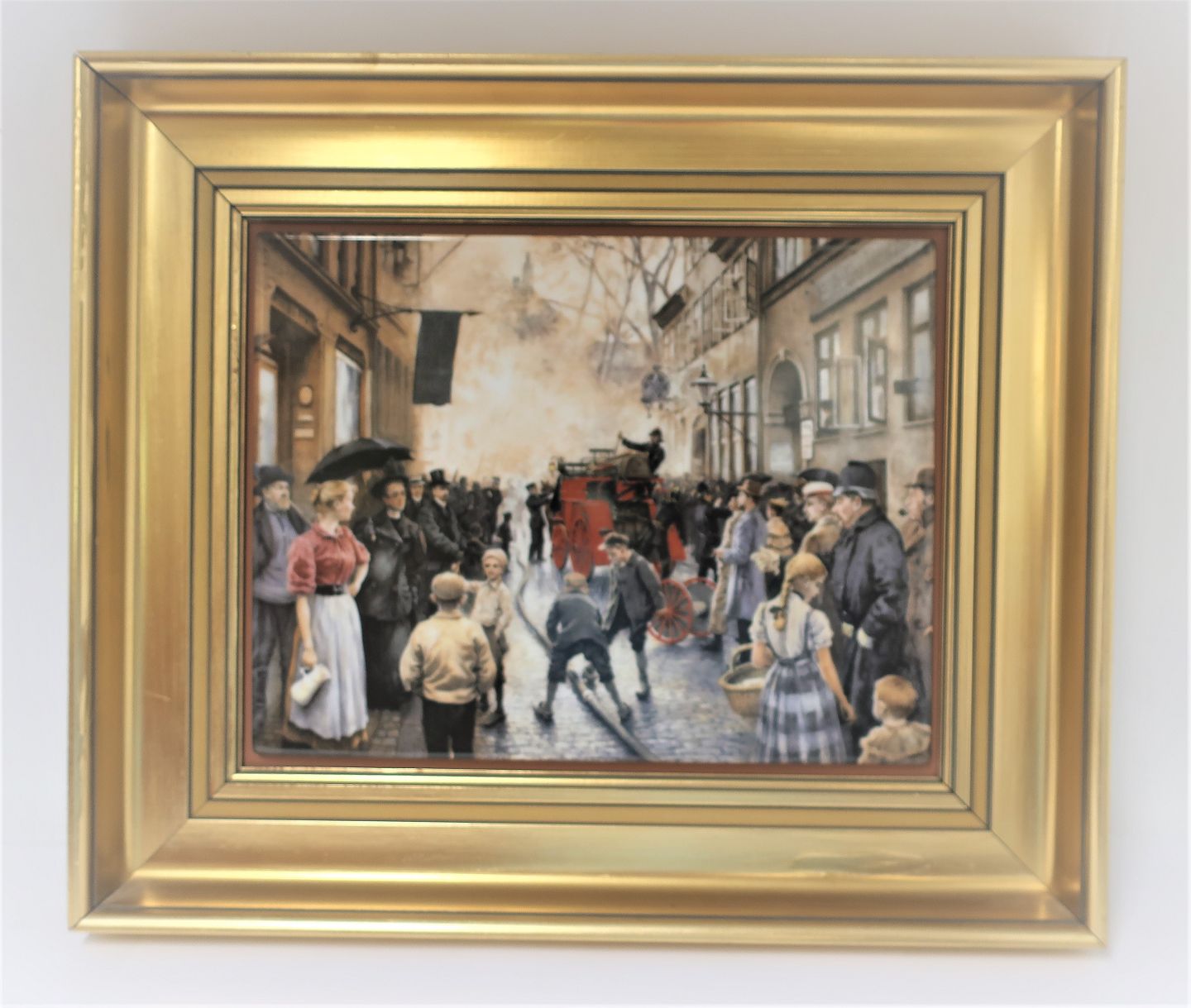 Bing & Grondahl. Porcelain painting. Motif by Paul Fischer. Fire in Skindergade. Size inclusive frame, 40 * 33 cm. Produced 1750 pieces. This has number 273.