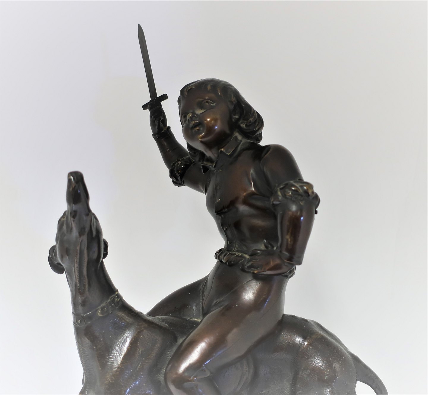 Bronze figure. Boy sitting on greyhound. Height 45 cm.