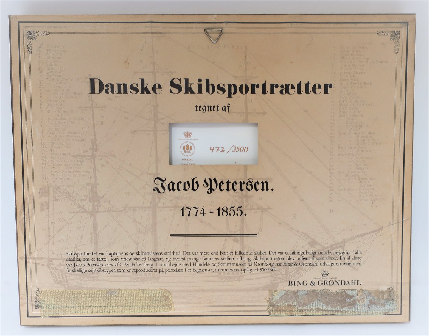 Bing & Grondahl. Porcelain. Danish ship portraits. Picture of "The schooner Princess Caroline of Copenhagen. Dimensions: Width 38 * 30 cm. 3500 have been produced, and this is no. 472.