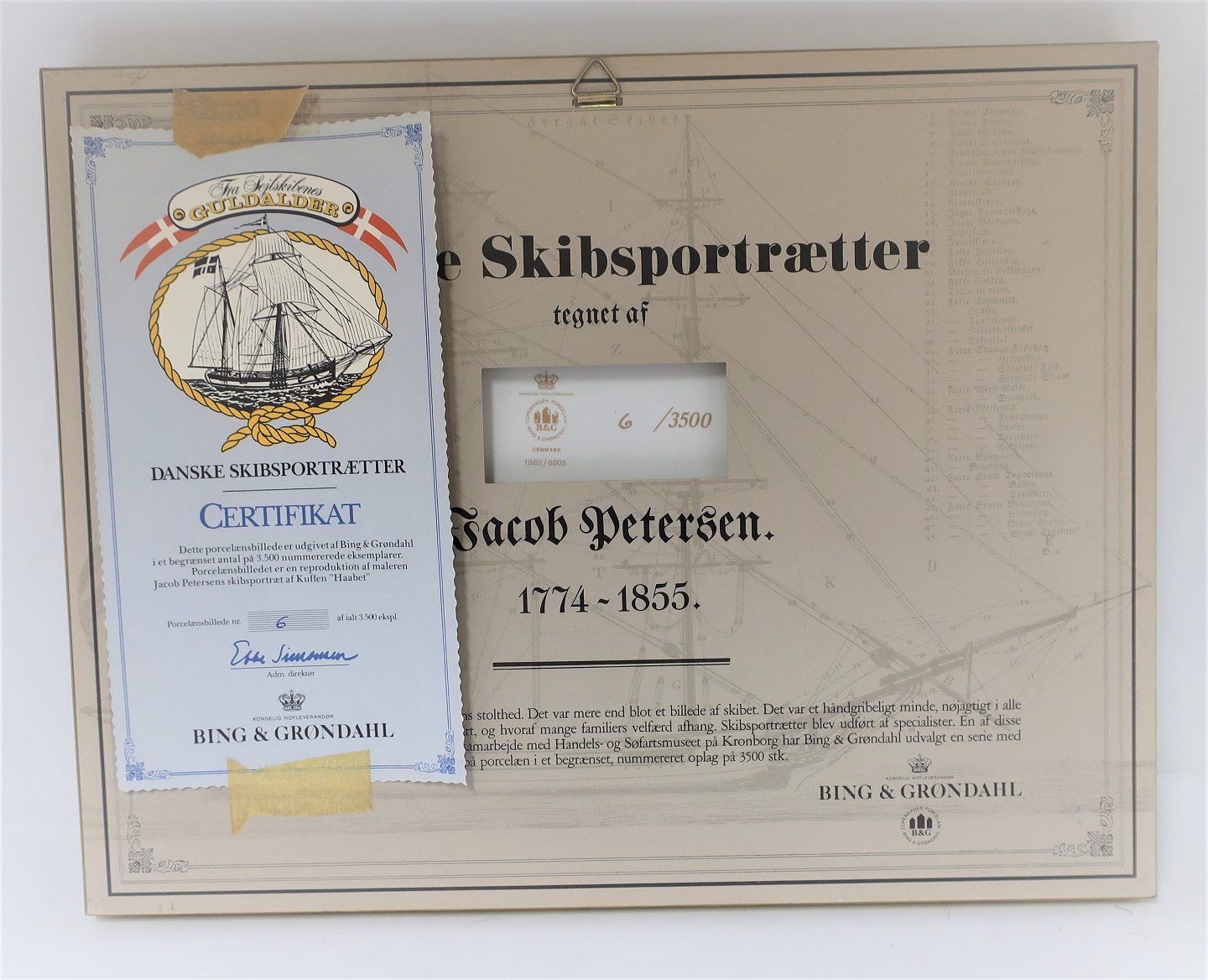 Bing & Grondahl. Porcelain. Danish ship portraits. Image of "Haabet". Dimensions: Width 38 * 30 cm. 3500 have been produced and this one is no. 6