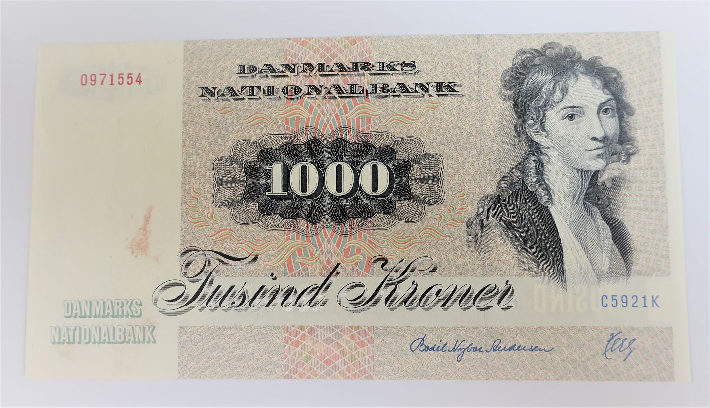 Denmark. Banknote DKK 1000 1992 C5. Quality; Uncirculated. Banknote has a small stain