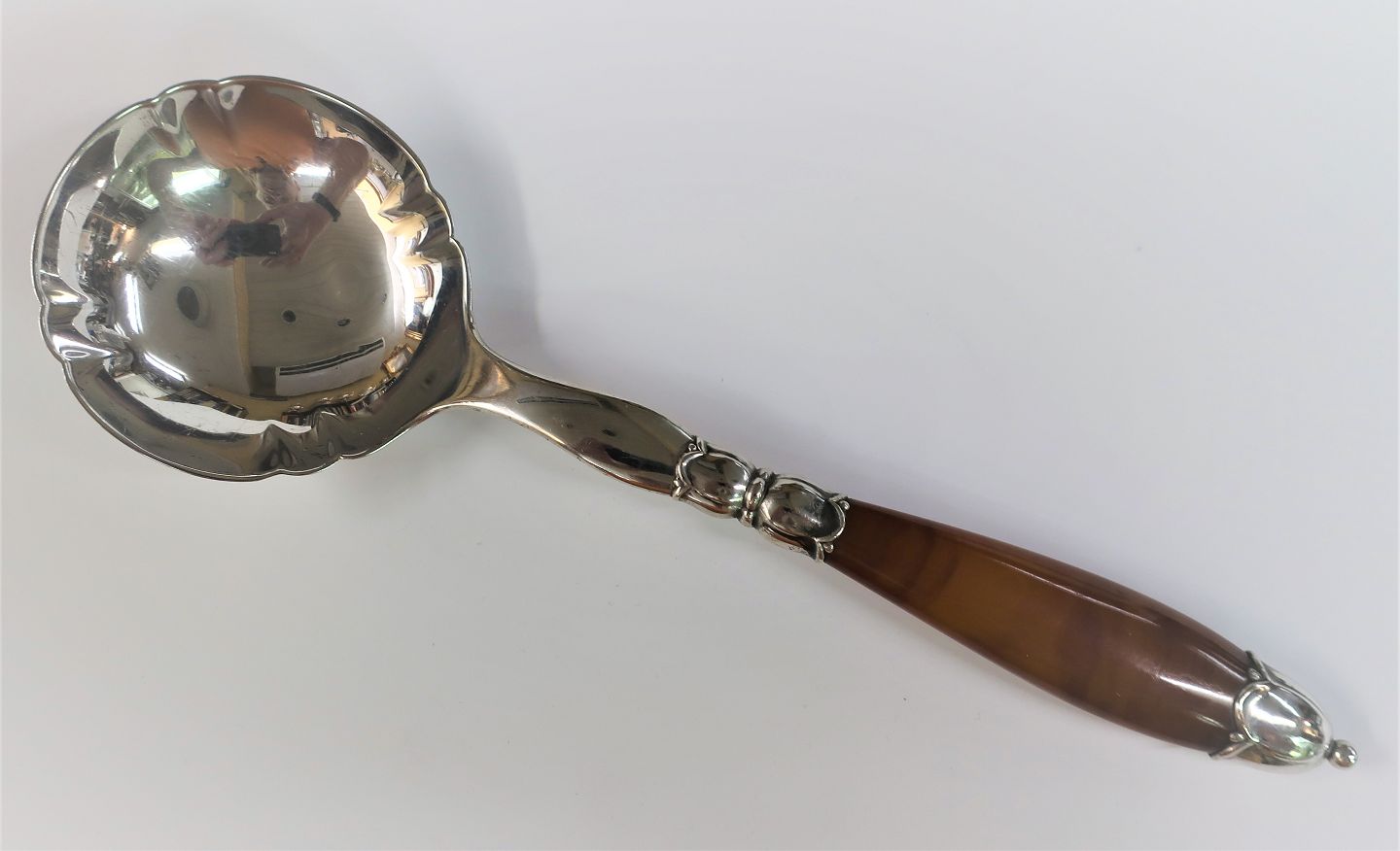 Sølv serveringsske med kunst rav. (830). Længde 23 cm. Produceret 1928