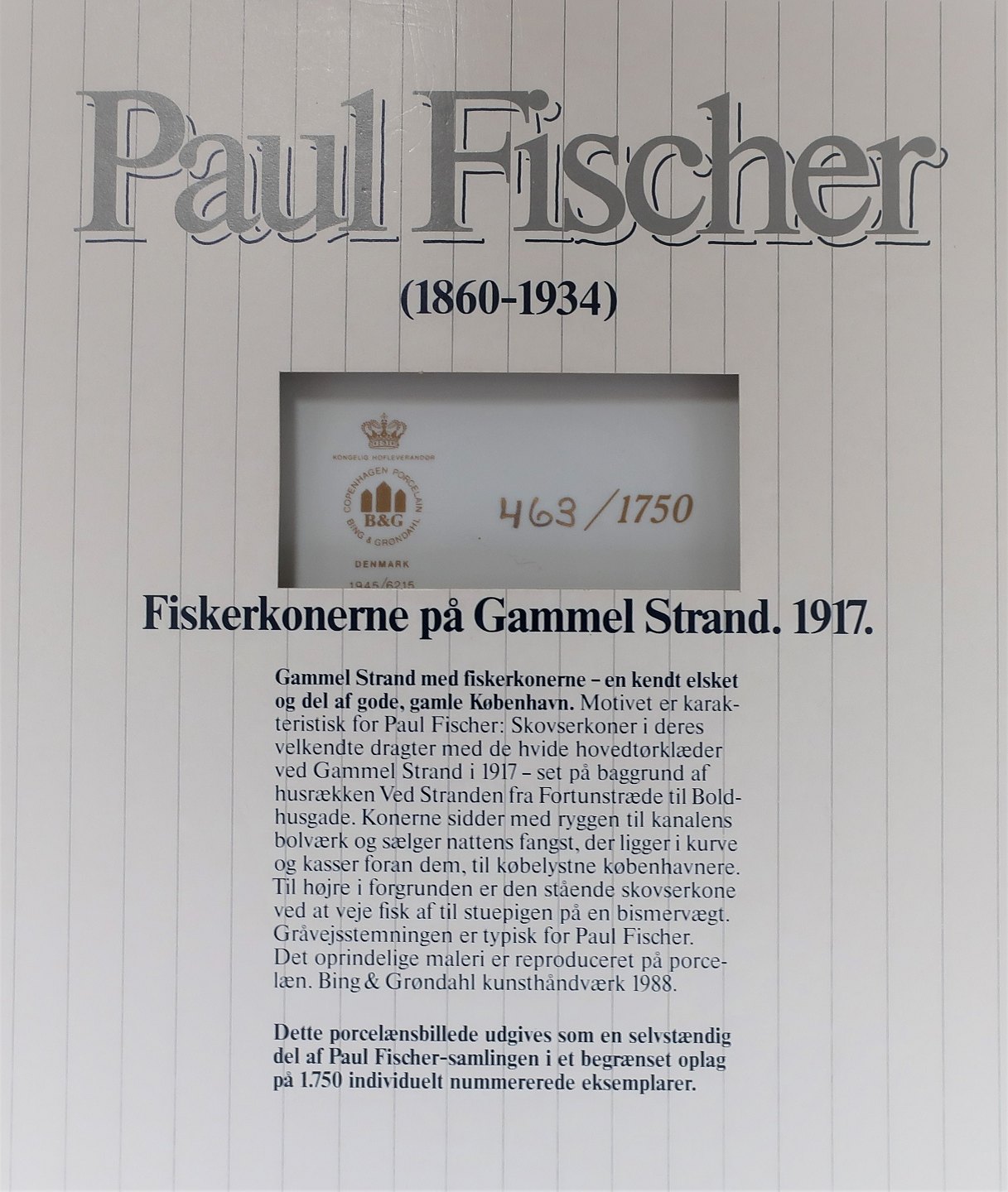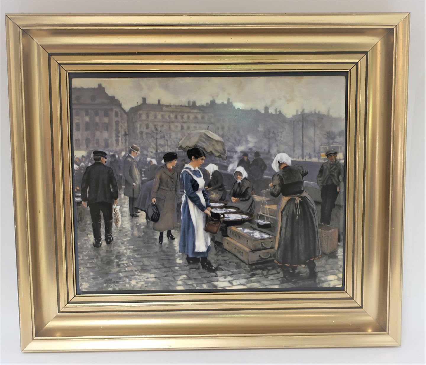 Bing & Grondahl. Porcelain painting. Motif by Paul Fischer. The fishermen's wives at Gammel Strand. Size inclusive frame, 42 * 36 cm. Produced 1750 pieces. This has number 463.