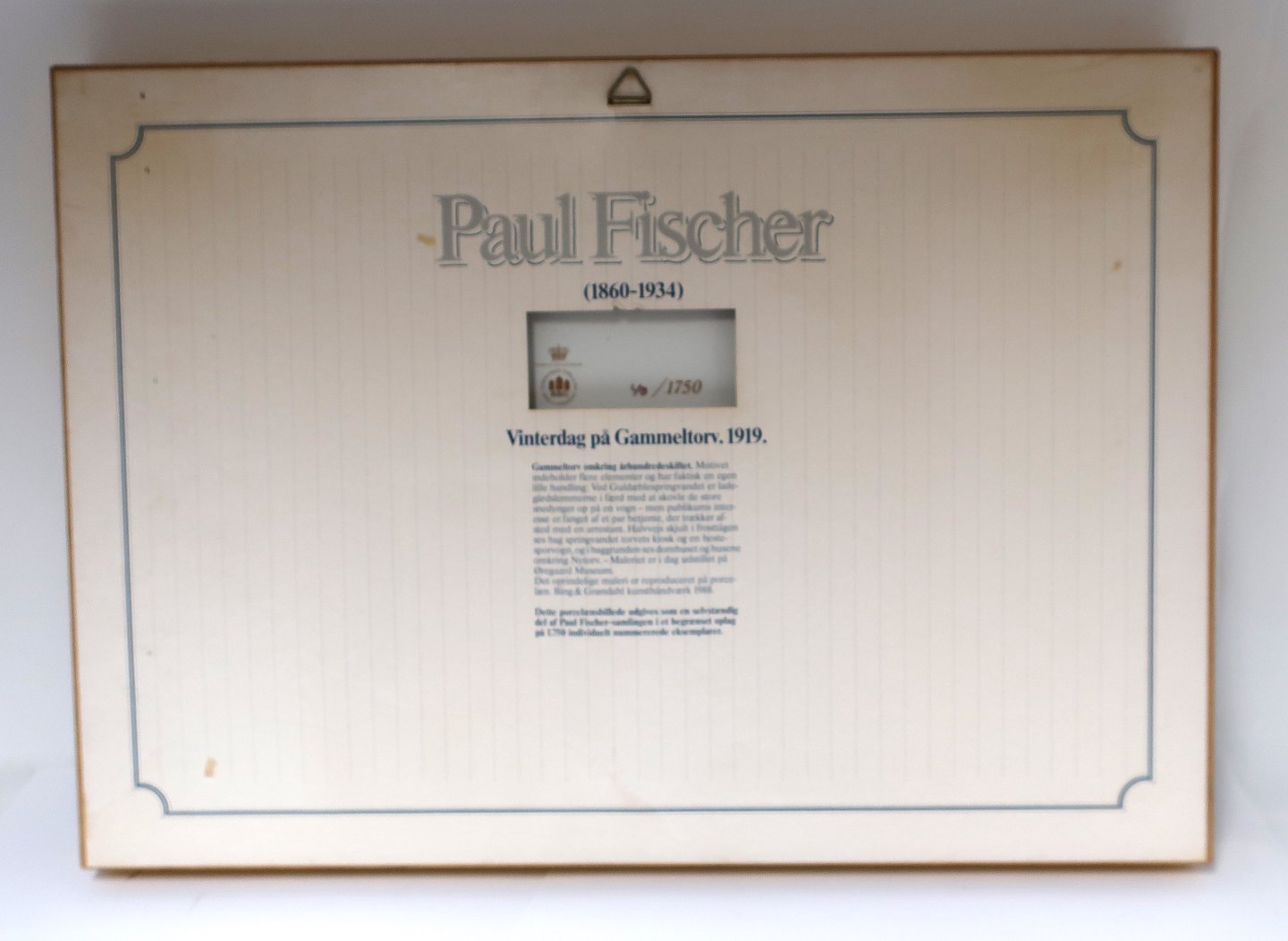 Bing & Gröndahl. Porzellanmalerei. Motiv von Paul Fischer. Wintertag am Gammeltorv. Größe inklusive Rahmen, 47 * 33 cm. Produziert 1750 Stück. Dieses hat die Nummer 40