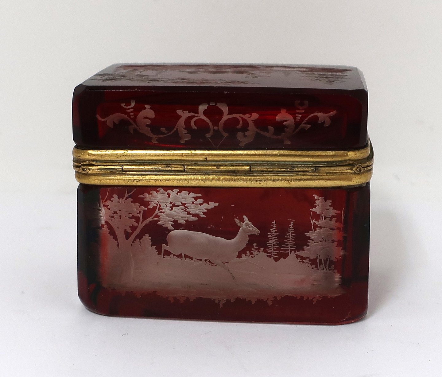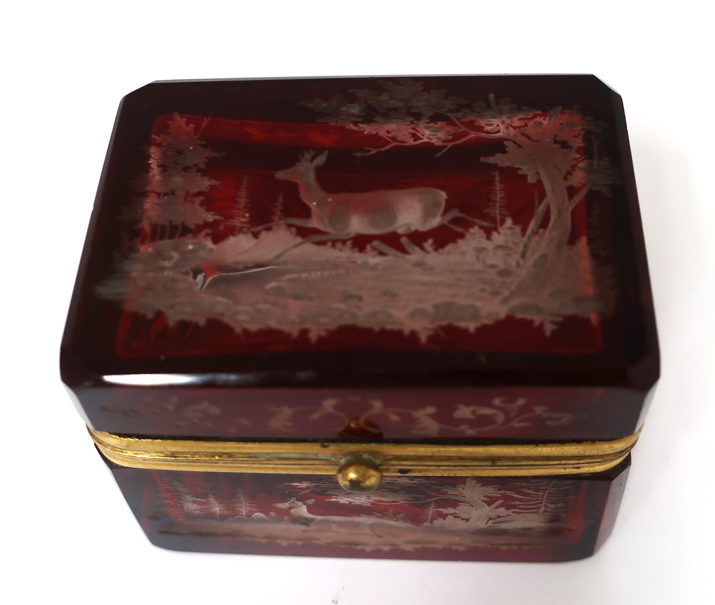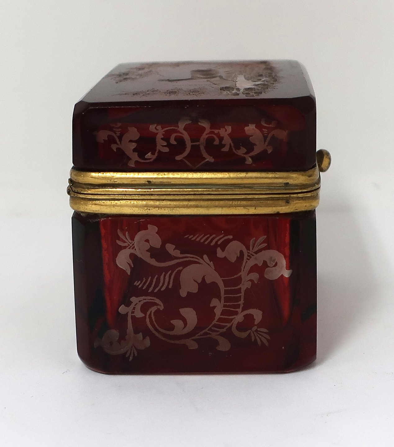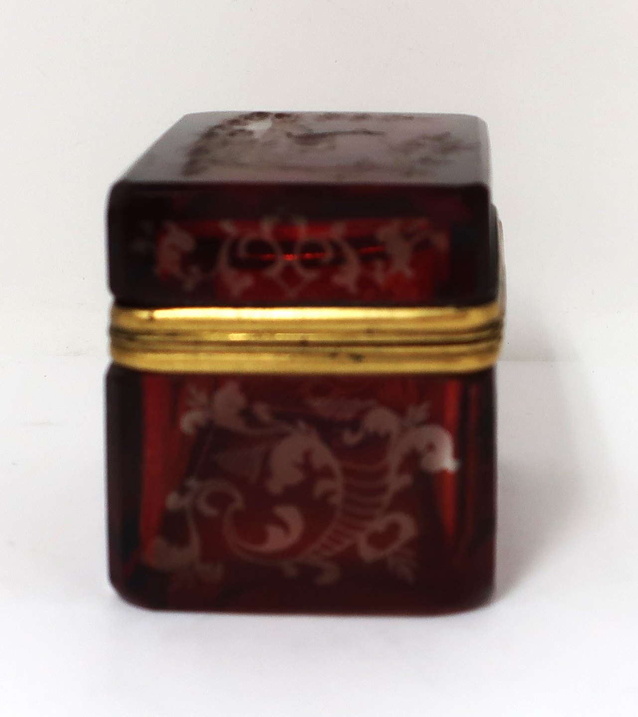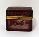 Lille sukkerskrin. Rødt glas. Højde 6 cm. Bredde 5 cm. Længde 7,2 cm.