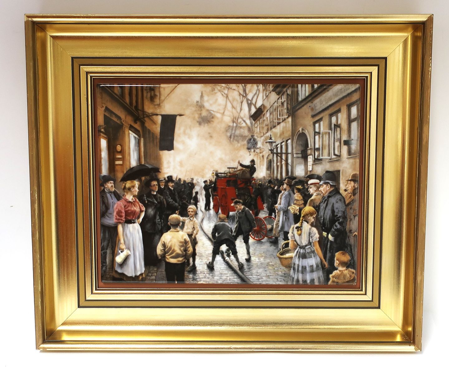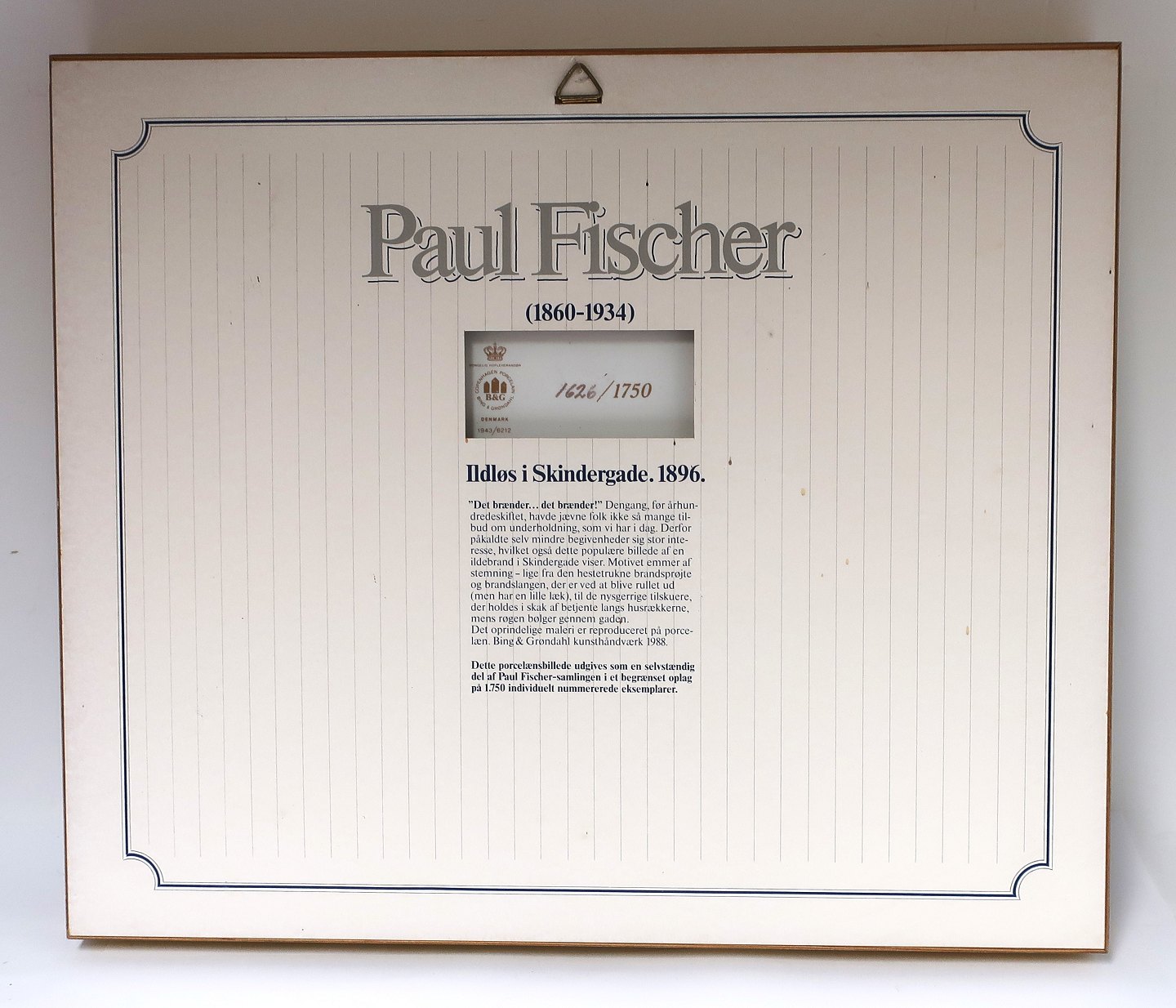 Bing & Grondahl. Porcelain painting. Motif by Paul Fischer. Fire in Skindergade. Size inclusive frame, 40 * 33 cm. Produced 1750 pieces. This has number 1626