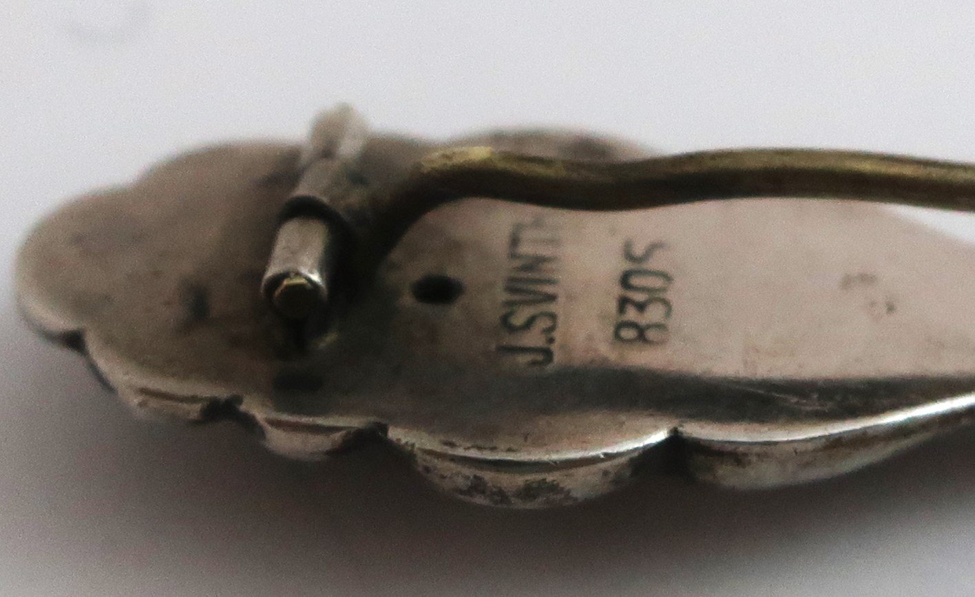 J. Svinth. Silver pin / brooch with green stone (830). Length 6 cm.