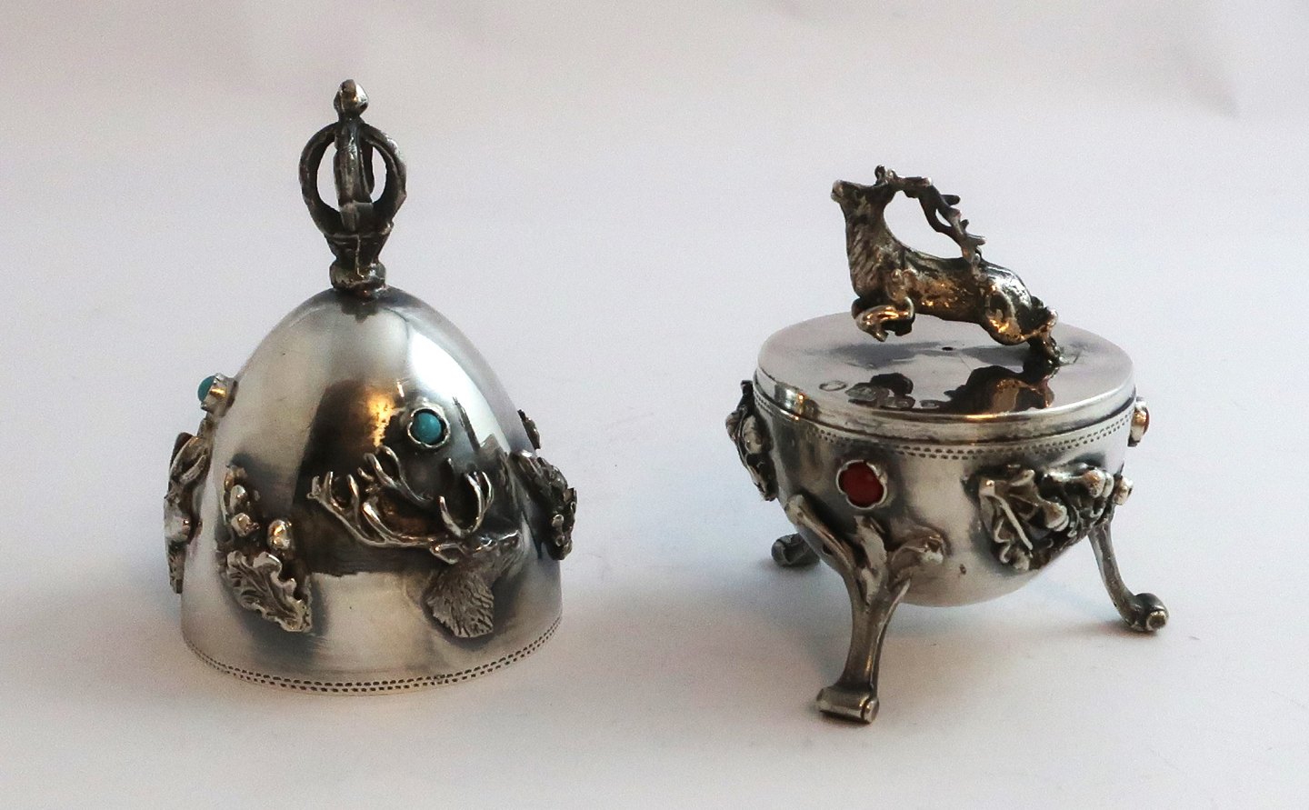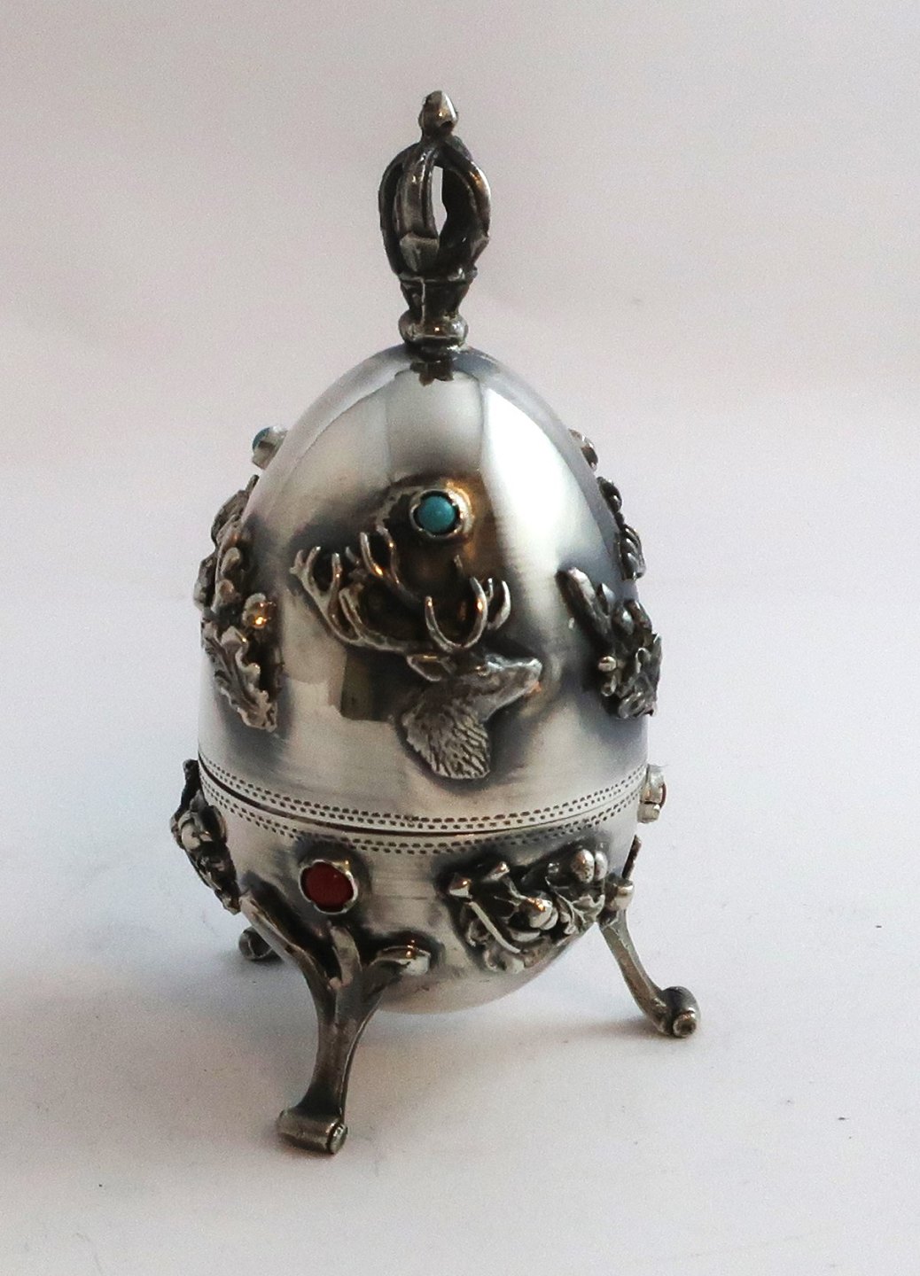 Russia. Silver egg with colored stones (84) 875. There is a red deer hidden under the lid. Height 10 cm. Produced 1878.