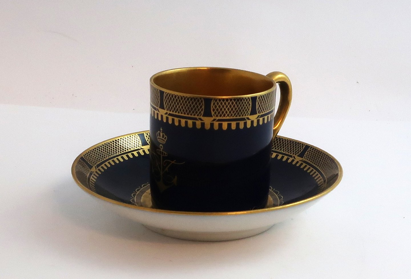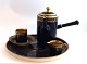 Bing & Gröndahl. Tray, mocha pot, creamer and cup with King Frederik the 9th's & Queen Ingrid's mark. Diameter of the tray is 27 cm.