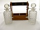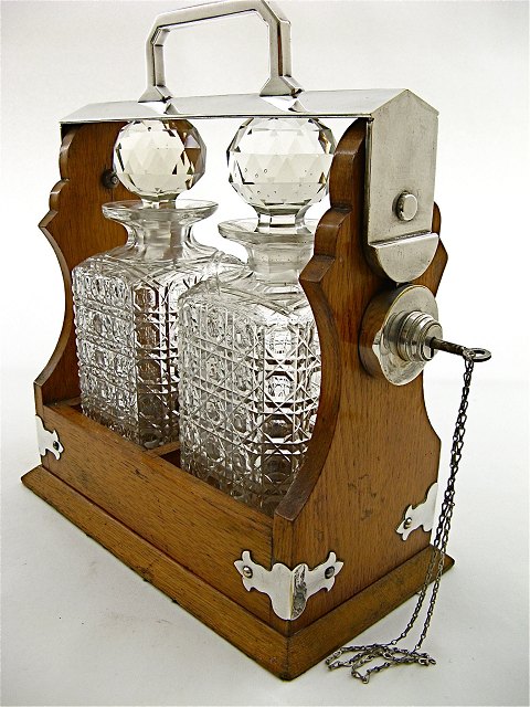 1800-tals engelsk tantalus 2 slebne karafler i en egetræs kasse med forsølvede beslag længde 25 cm. højde 30 cm.