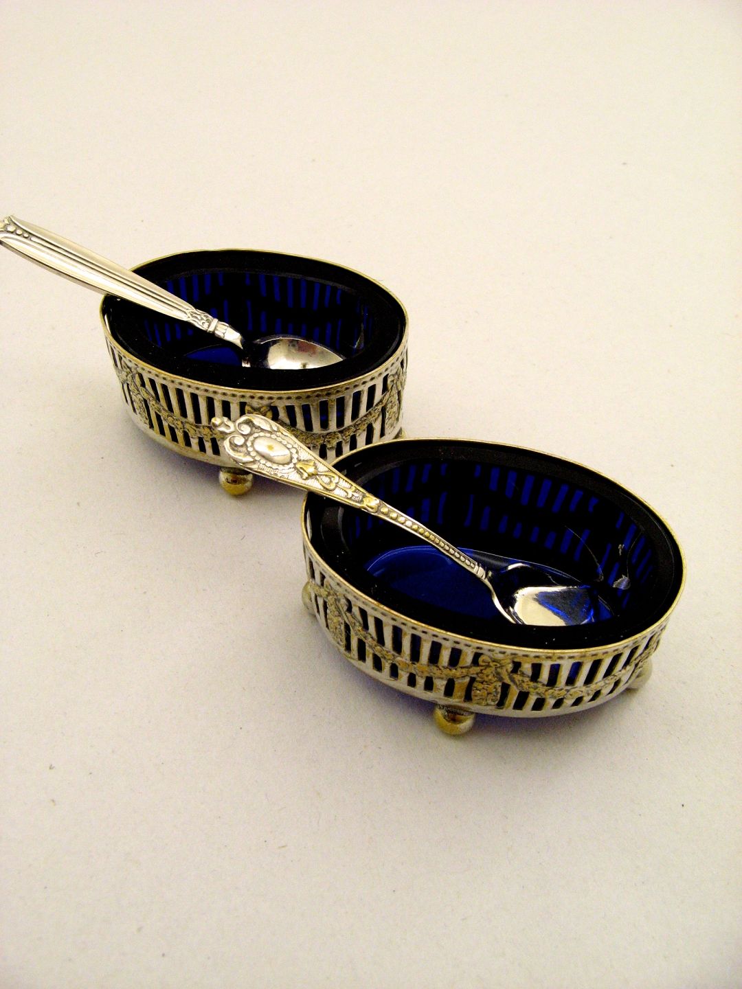 Forsølvet saltkar med blåt glasindsats 5,5 x 3,7 cm.