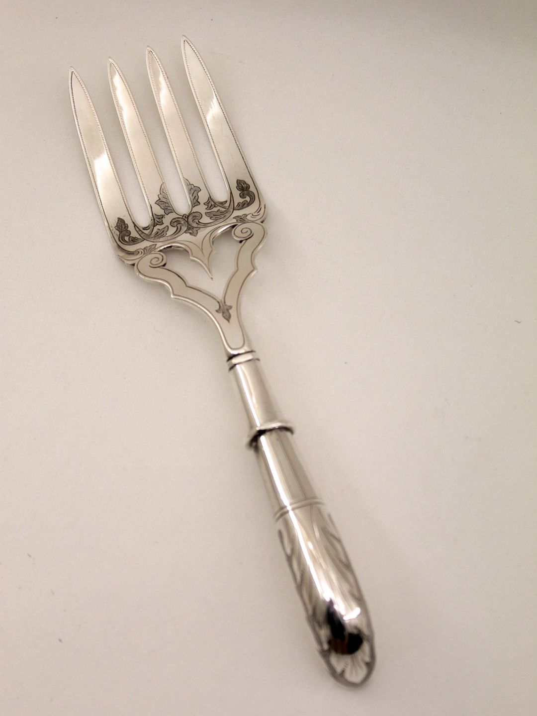 Sølvsmed Frederik Vilhelm Albertus Gundorf Assens fiske serveringsgaffel længde 26 cm. med bystempel 19.årh.