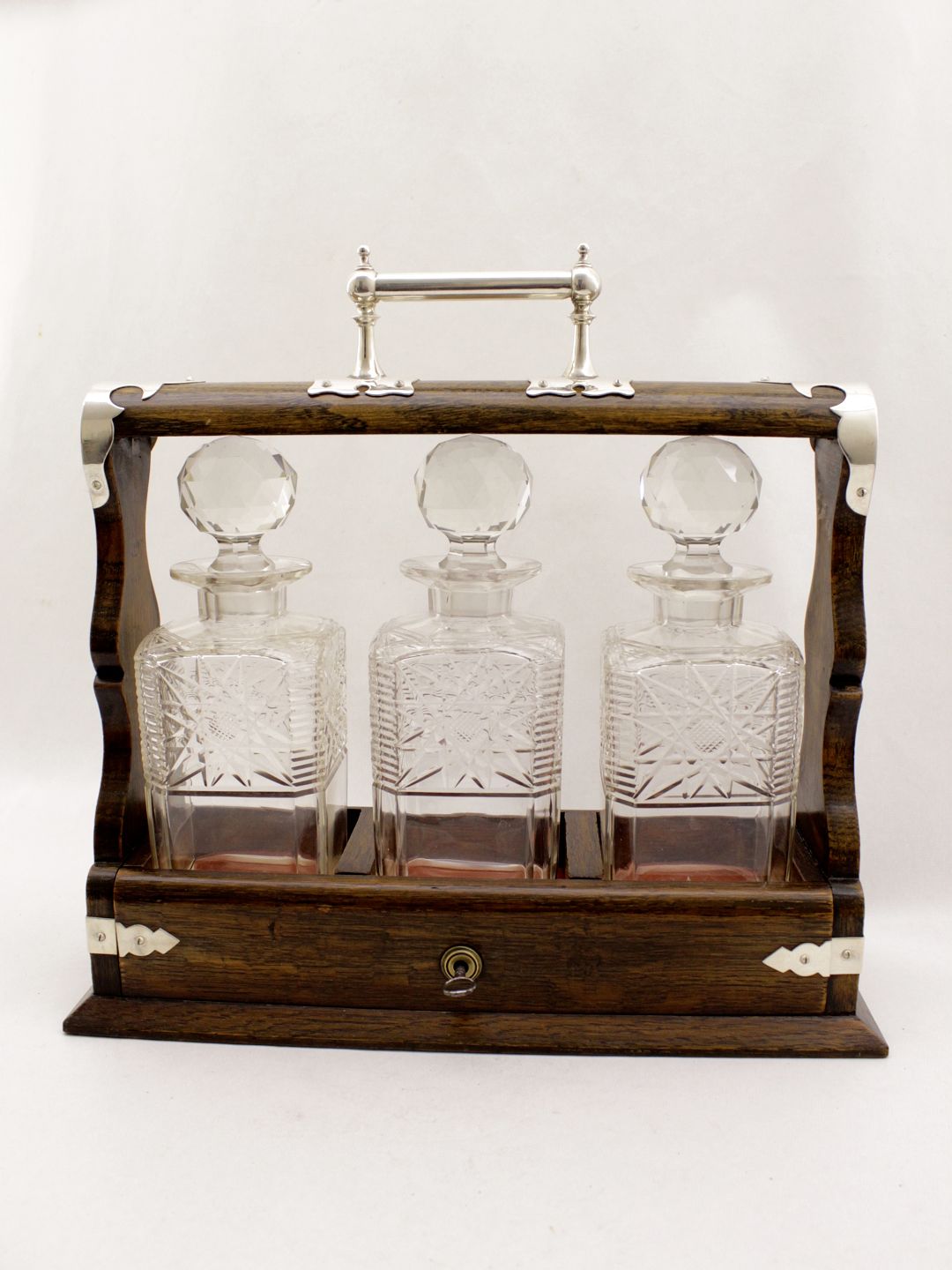 Engelsk tantalus egetræs box med forsølvet montering tre karafler 19.årh. Nr. 268836