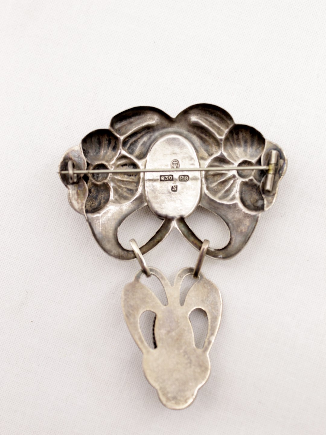 Jugend Brooch 6 x 8 cm. 830 silver with amber silversmith P. Ørsnæs Ålborg No. 299365