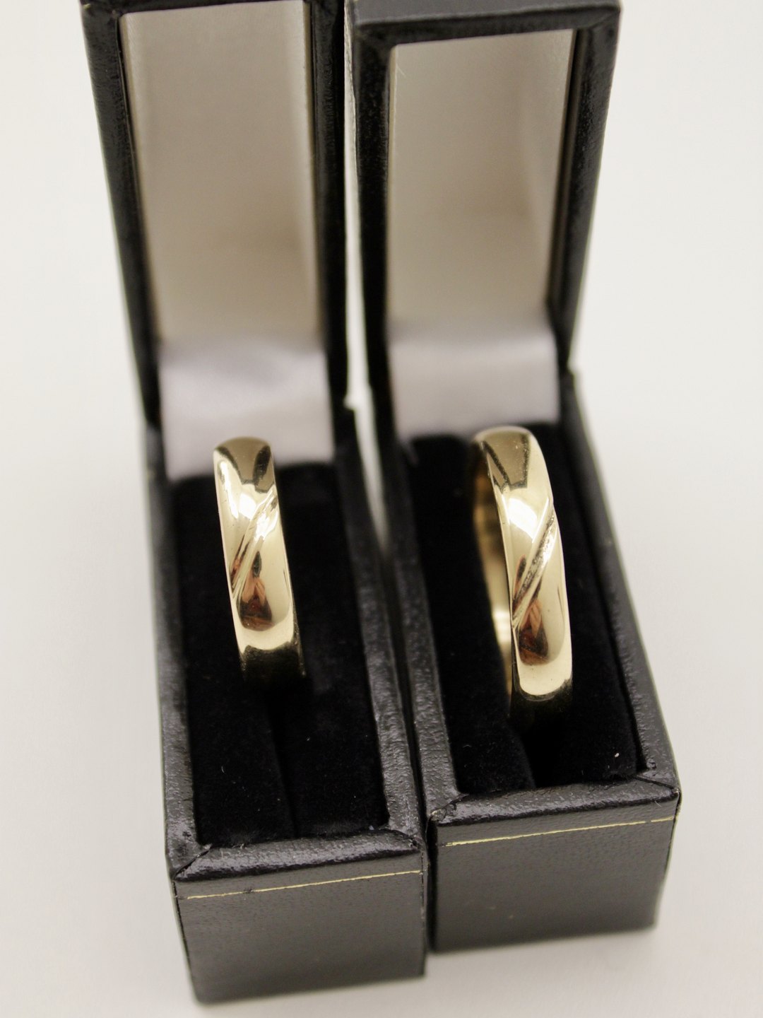 A pair of 14 carat gold design rings size 52 and 67 stamped 585 DD from Dedenroth Design Vejle no engraving No. 349994