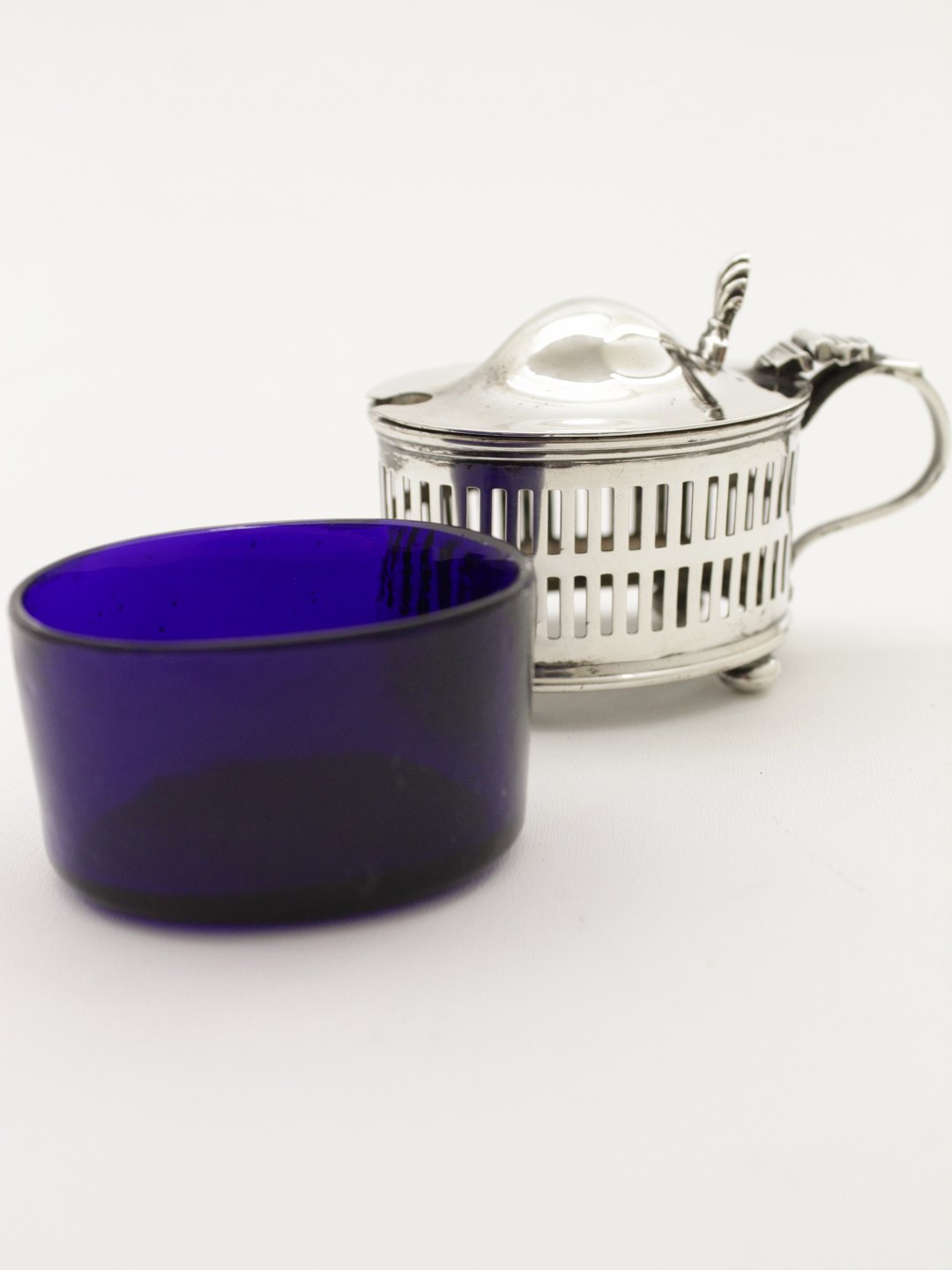 Sterling silver mustard container with blue glass H. 5cm. L. 8 cm. No. 365236