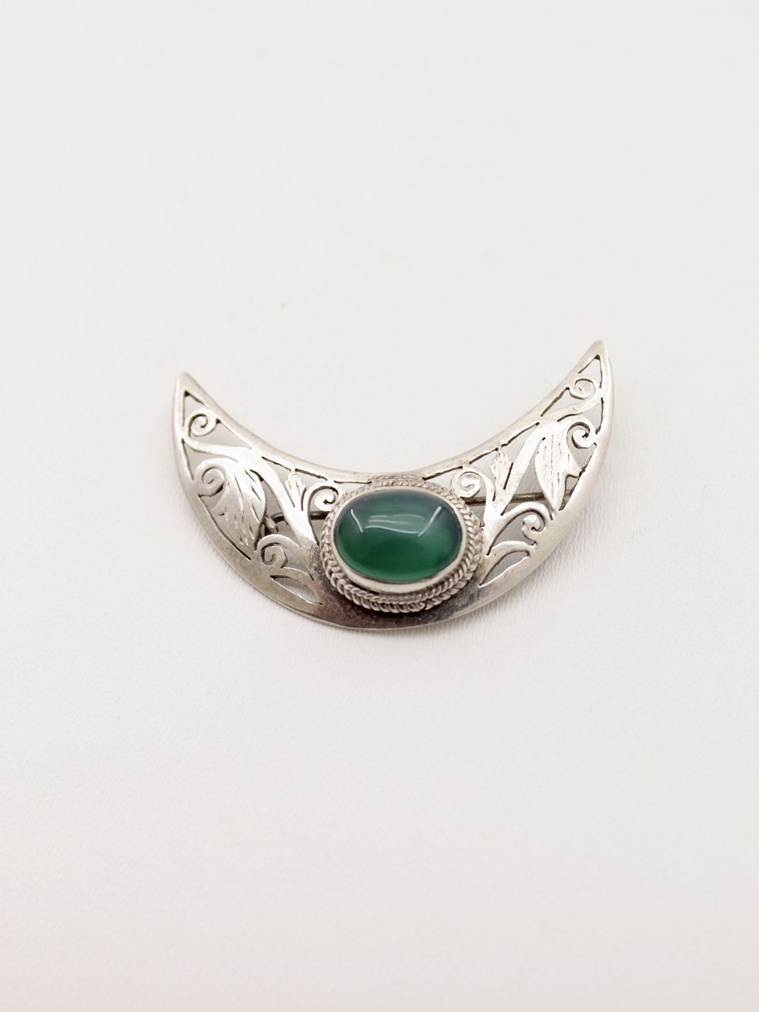 Sølv broche L. 4 cm. med cabochon sleben krysopras