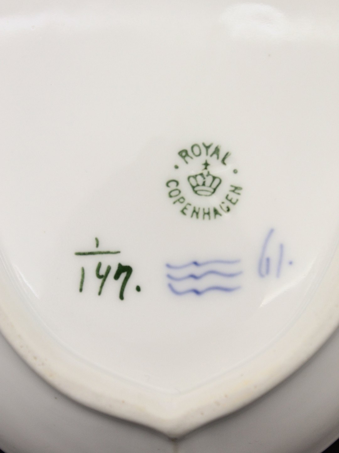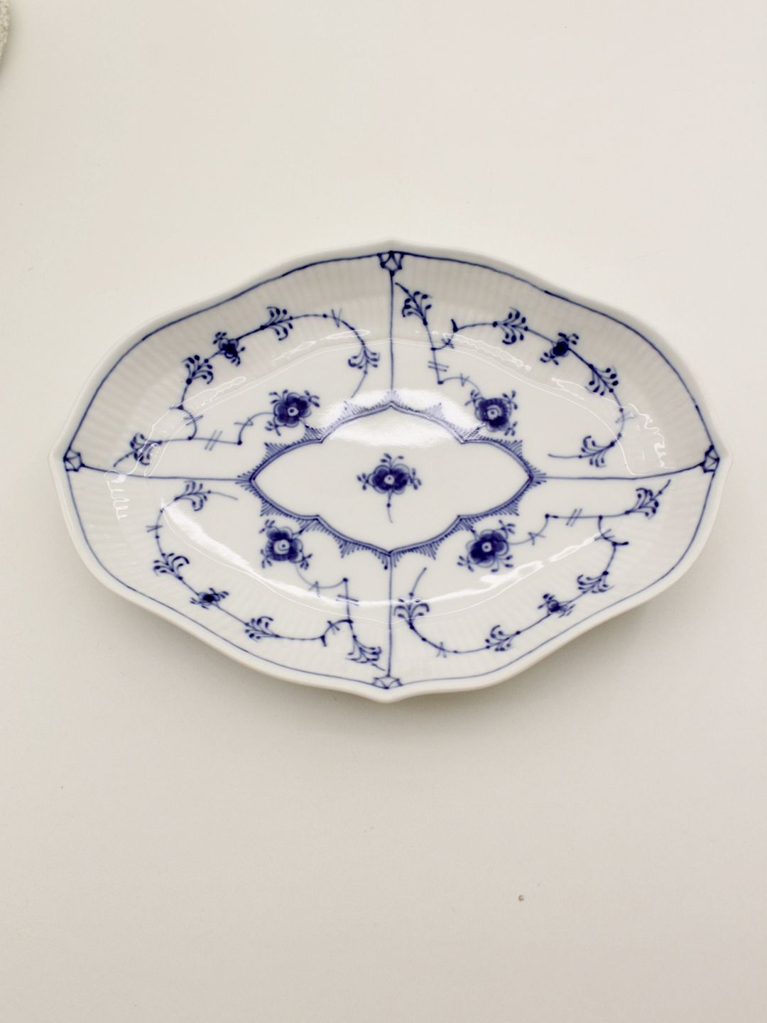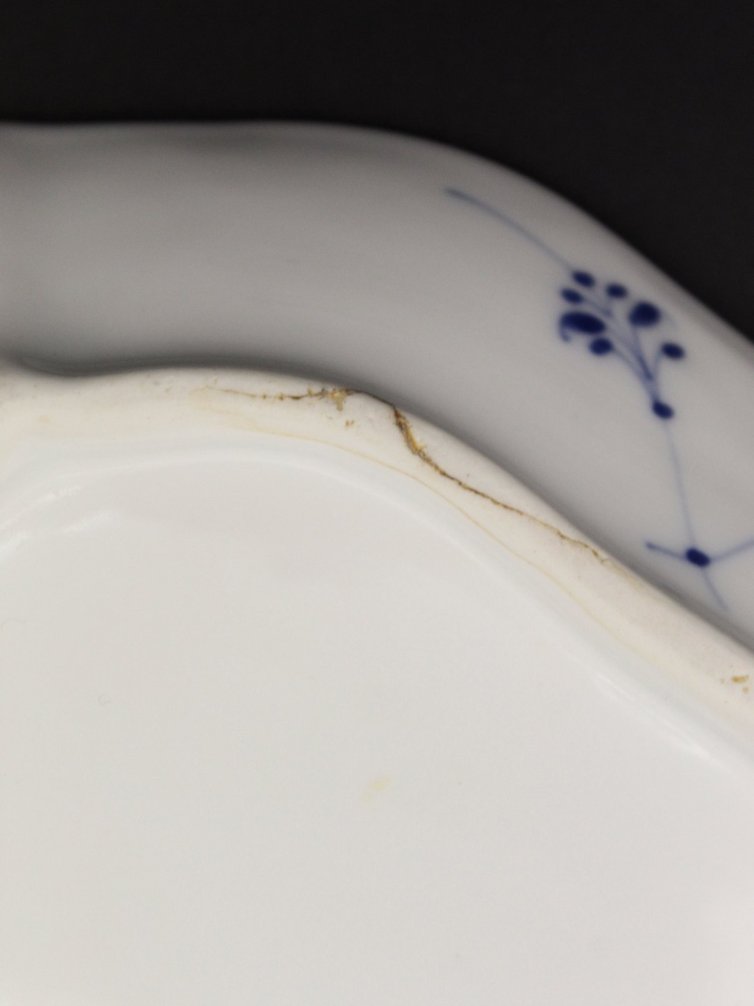 Royal Copenhagen musselmalet riflet ovalt fad 1/147 22,5 x 16 cm. Nr. 385287 brændings fejl ved fod.