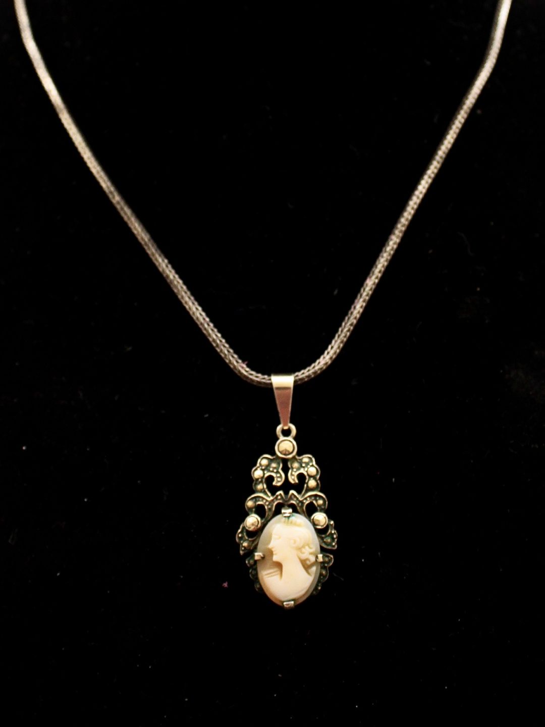 Sølv halskæde 43 cm. og came vedhæng 1,6 x 3 cm. monteret i sølv. Nr. 404973