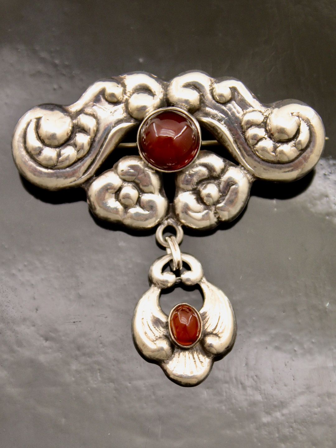 Art nouveau/jugend sølv broche 5,2 x 5,5 cm. med rav fra juveler Bernhard Hertz København Nr. 422853