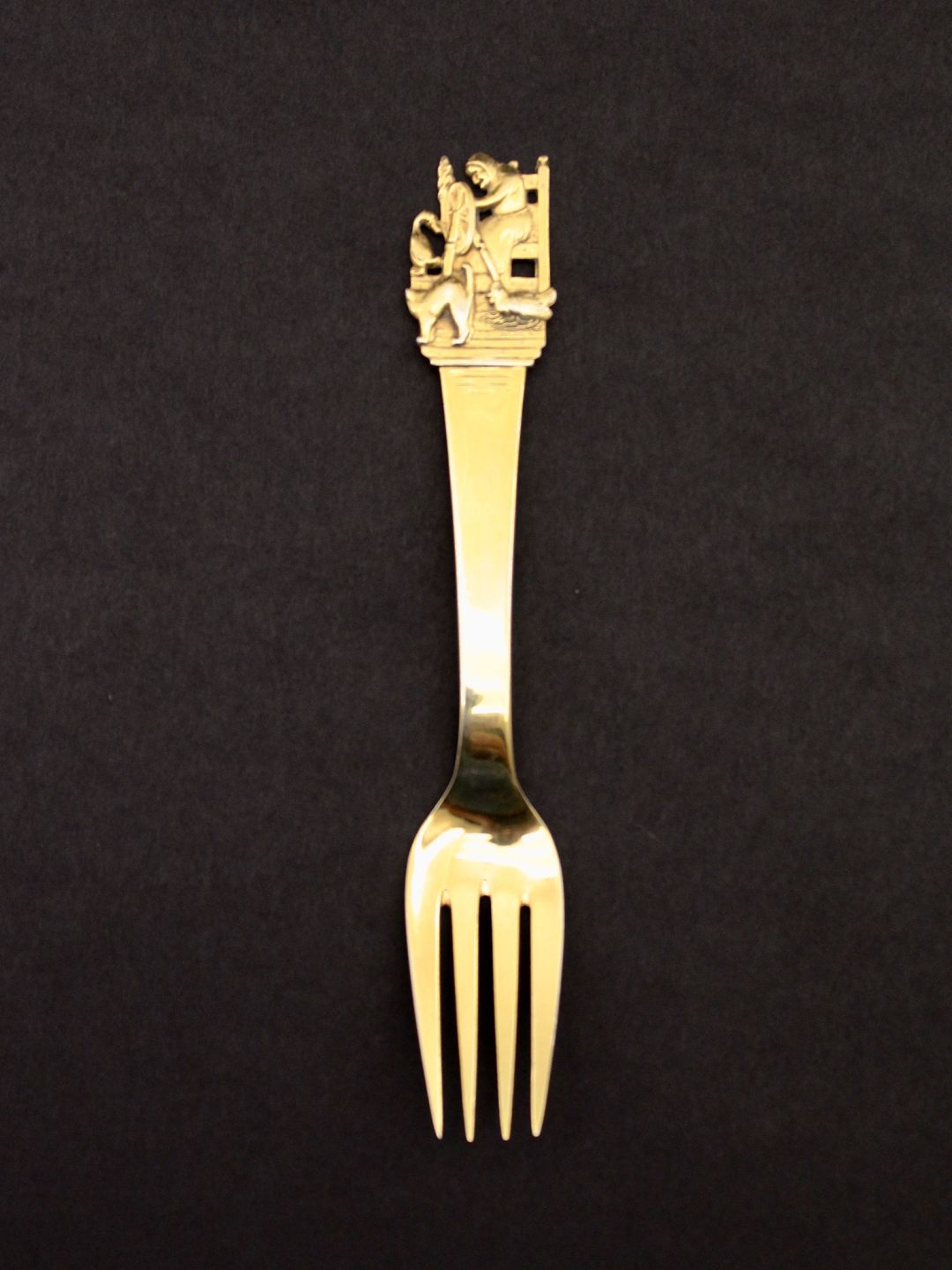 H C Andersen "Spinderokken" barne gaffel forgyldt tretårnet sølv fra Horsens Sølv flot ingen graveringer Nr. 429173