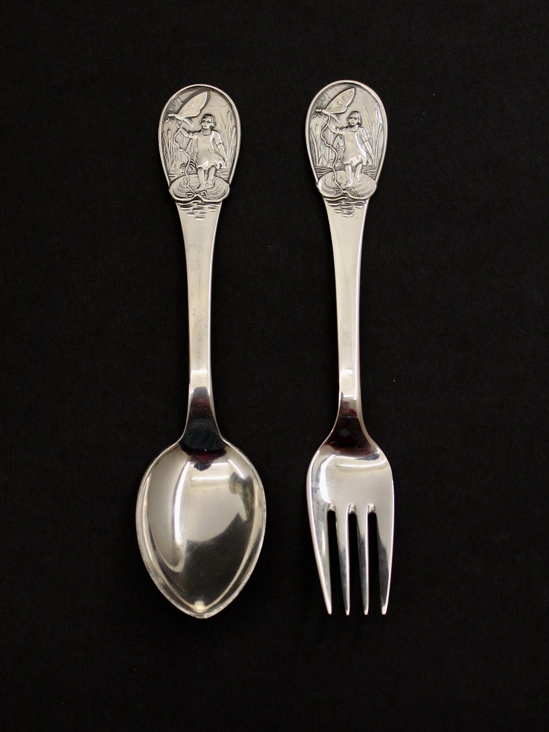 H C Andersen barne ske/gaffel 14,5 cm. "Tommeliden" flot ingen graveringer tretårnet sølv emne nr. 485193