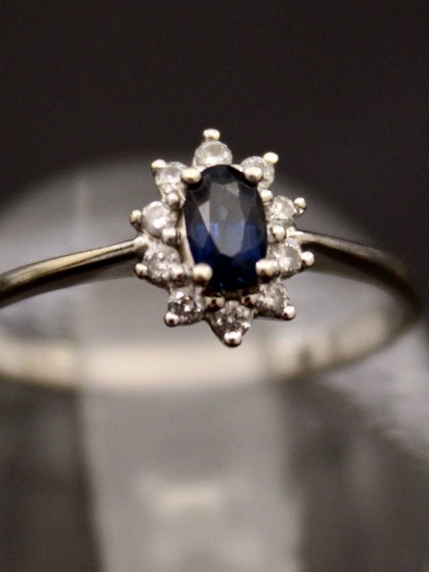 Roset ring størrelse 56 i 14 karat hvidguld med blank overflade og 10 brillantslebne diamanter og facetsleben blå safir emne nr. 485212