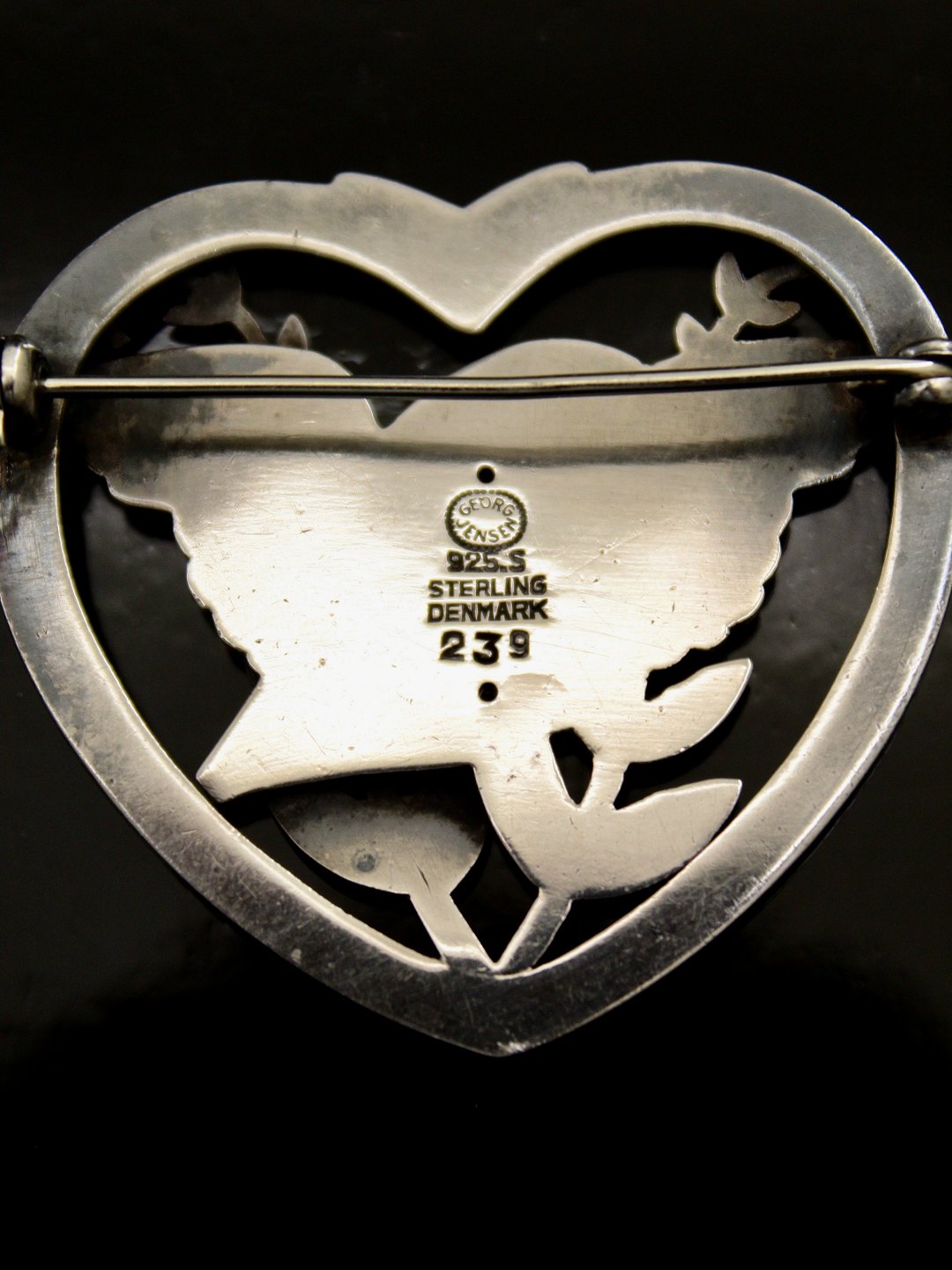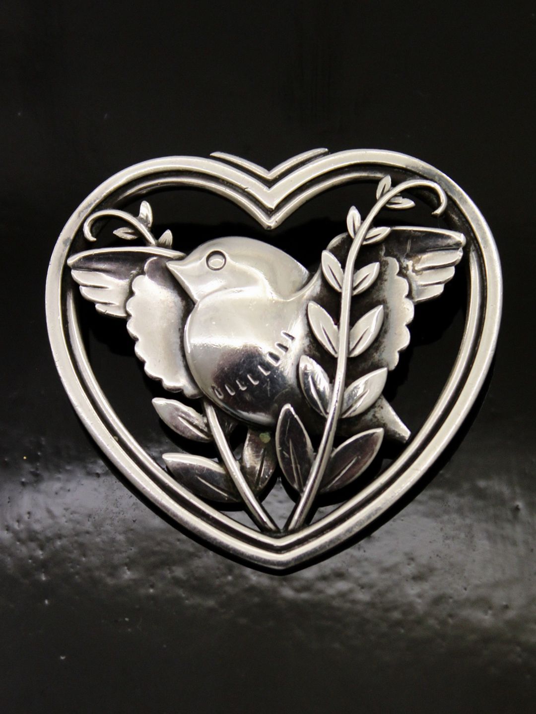 Arno Malinowski for Georg Jensen. Hjerteformet broche sterlingsølv med fugl på kviste, dessin nr.: 239, udført hos Georg Jensen emne nr. 493783