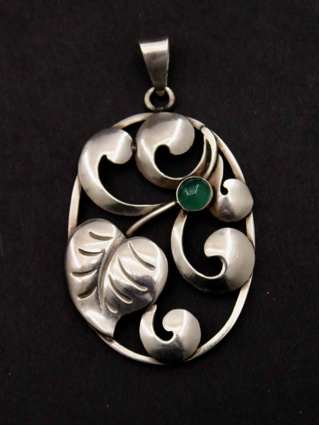 Art nouveau 830 sølv vedhæng 3,5 x 5 cm. med grøn agat fra sølvsmed Hans Jensen København emne nr. 493982