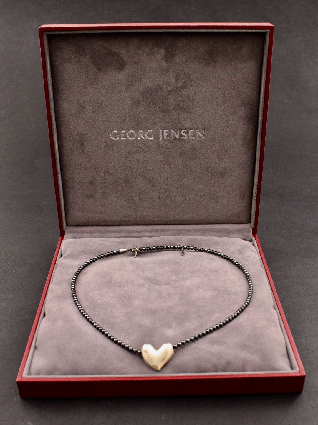 Georg Jensen design Allan Scharff hjerteformet vedhæng af sterling sølv med kæde af hæmatit 247A emne nr. 503224