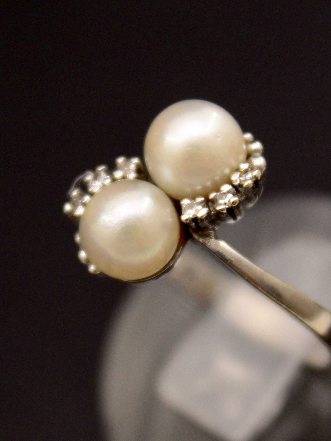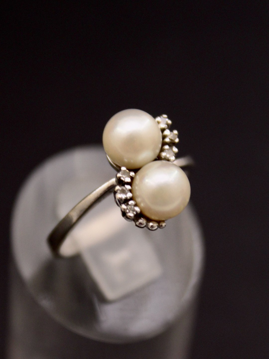 14 karat hvid guld ring størrelse 56 med 6 diamanter og 2 ægte perler fra guldsmed Volmer og Bahner København emne nr. 526614