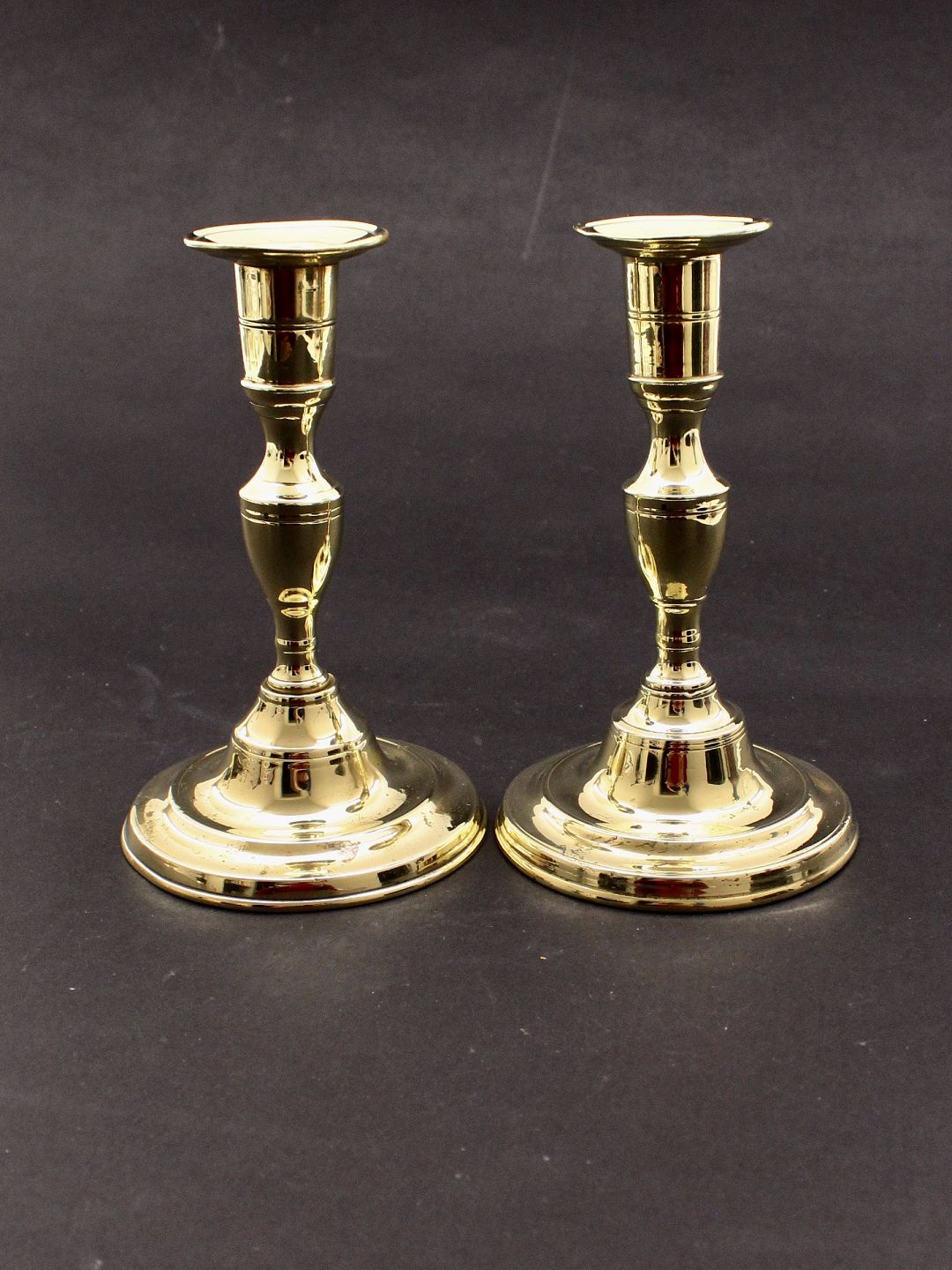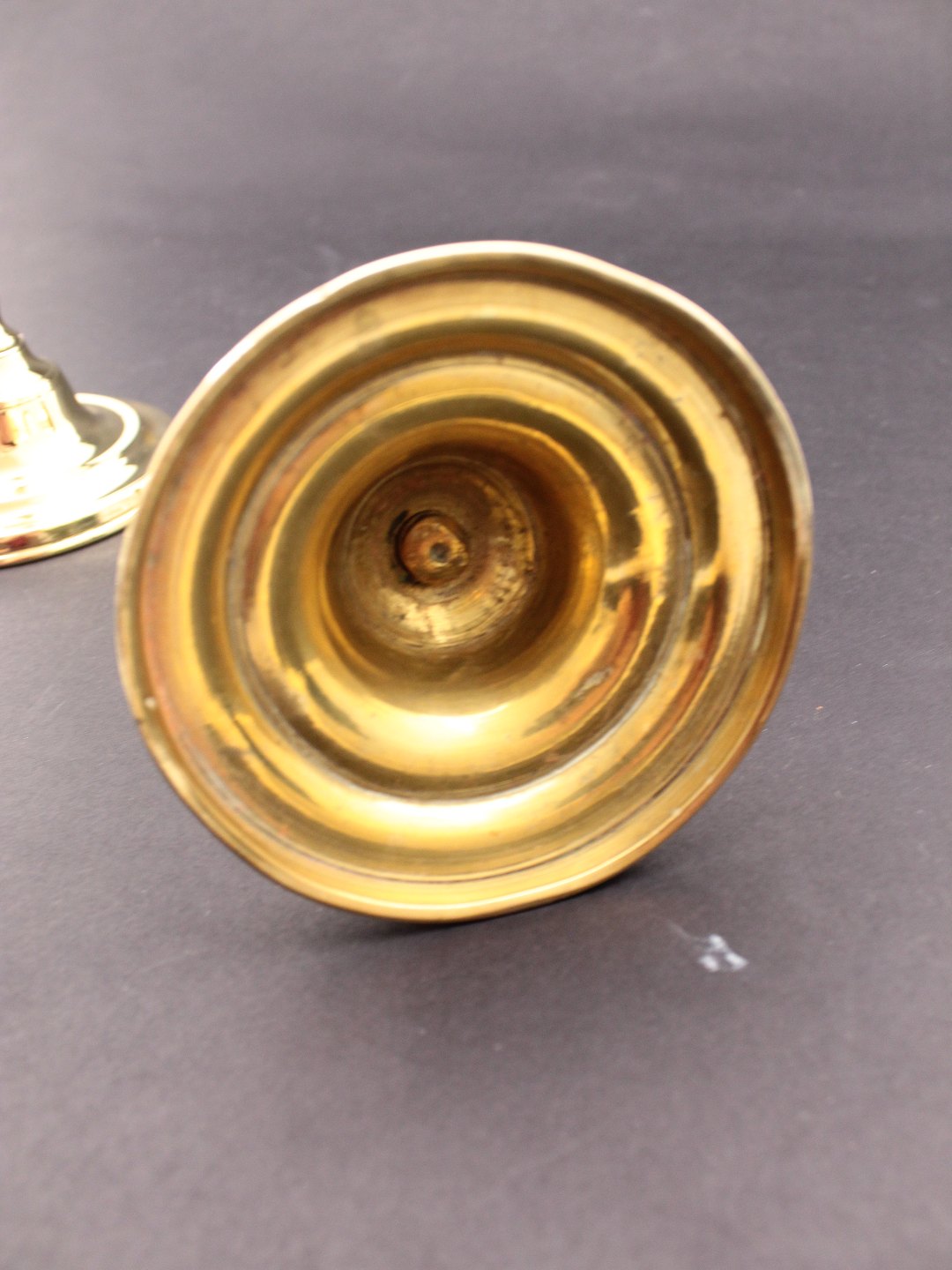 Messing lysestager på rund fod 16 cm. 19.årh. emne nr. 529037