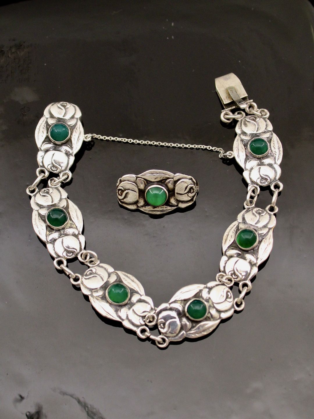 Sølv armlænke 18 cm. med grønne chyrocoprasser og broche 2,4 x 1,4 cm. fra B Hertz København emne nr. 542181