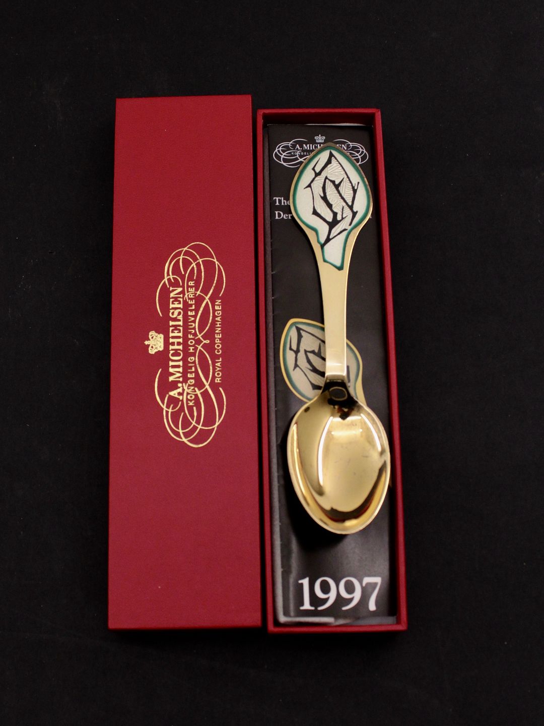 Anton Michelsen Christmas spoon gilded sterling silver with enamel motif. 1997 "The Burning Thornbush" designed by Maja Lisa Engelhardt nice condition item no. 561491