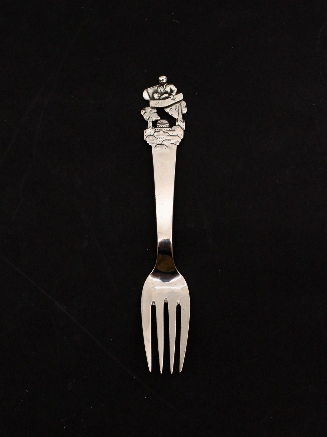 H C Andersen barne gaffel 14,5 cm. "Den Flyvende Kuffert" tretårnet sølv flot ingen graveringer. emne nr. 568846