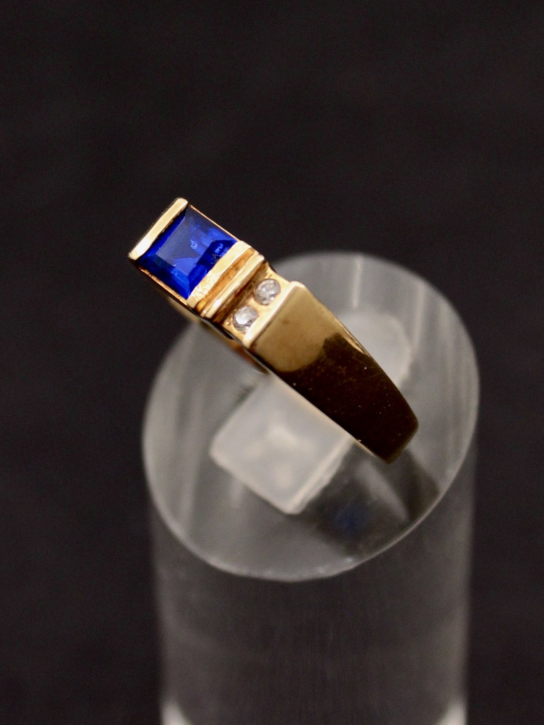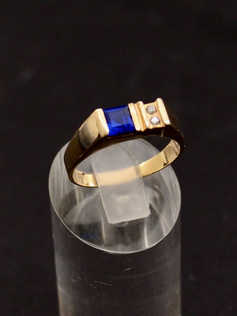 14 carat gold ring size 62 with 2 small clear and one large sapphire colored stone item no. 579489