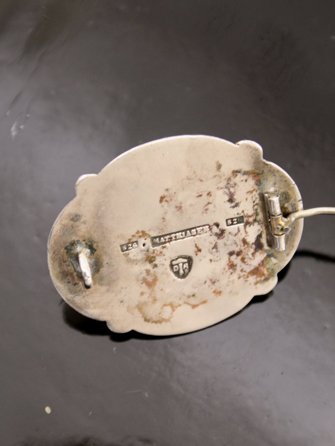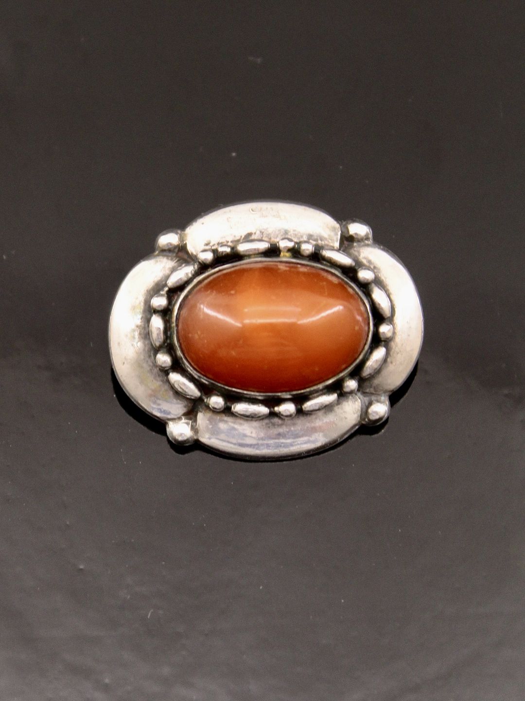 Sølv broche 3 x 3,6 cm. med rav 2,3 x 1,5 cm. fra sølvsmed H C Mathiasen emne nr. 589531