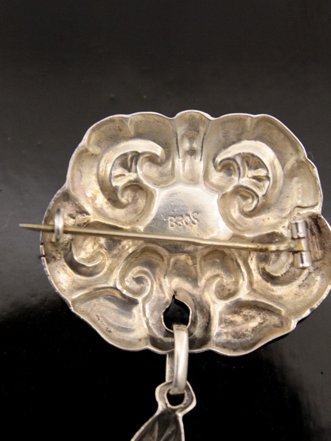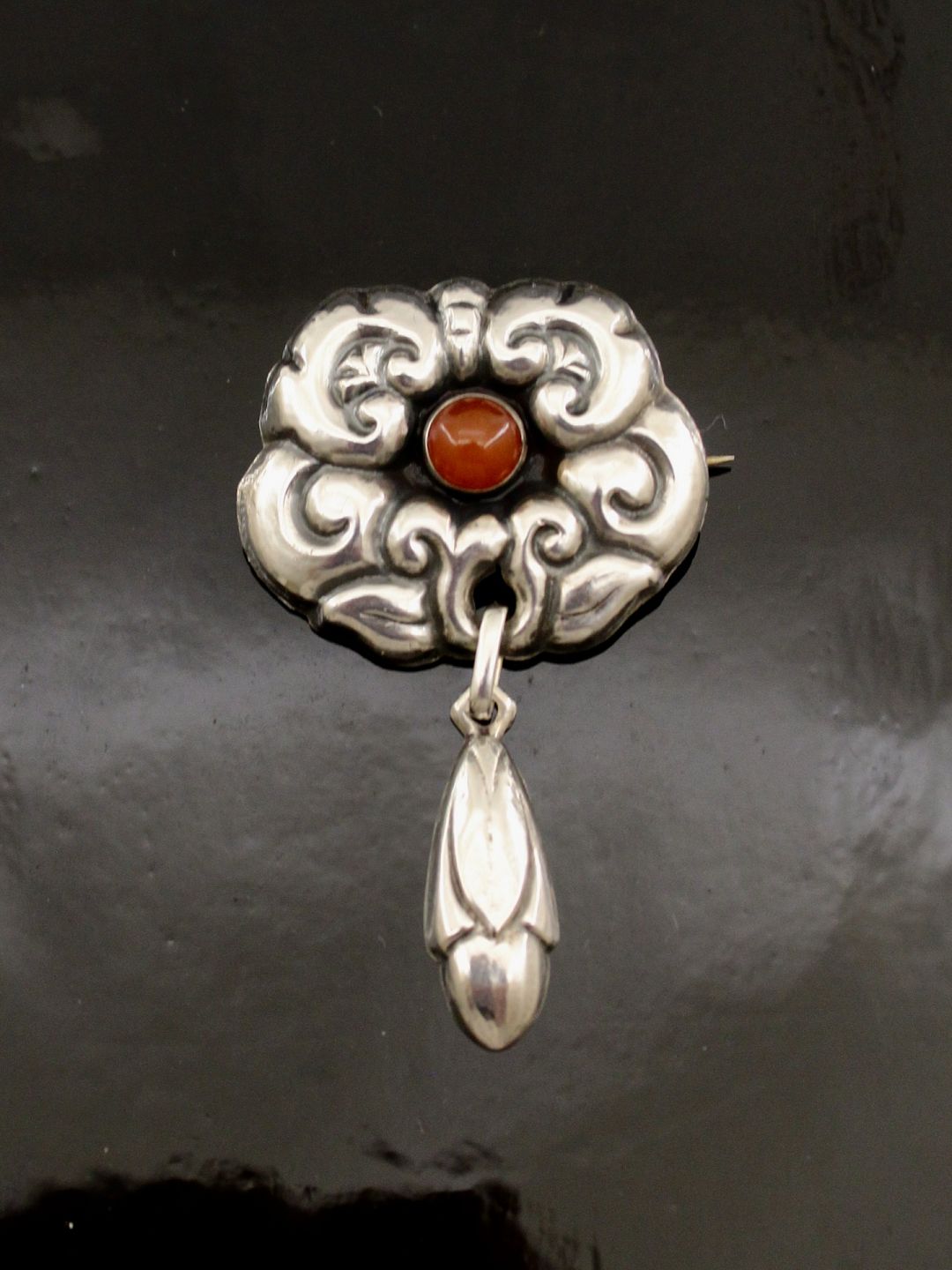 830 silver art nouveau brooch 6 x 3.5 cm. with amber subject no. 589919