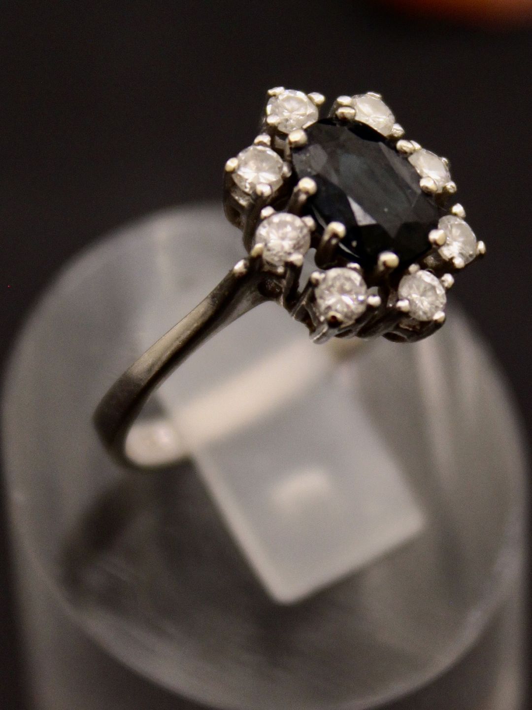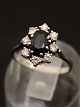14 karat hvidguld ring størrelse 52 med safir omgivet af diamanter på talt 0,32 carat emne nr. 596180