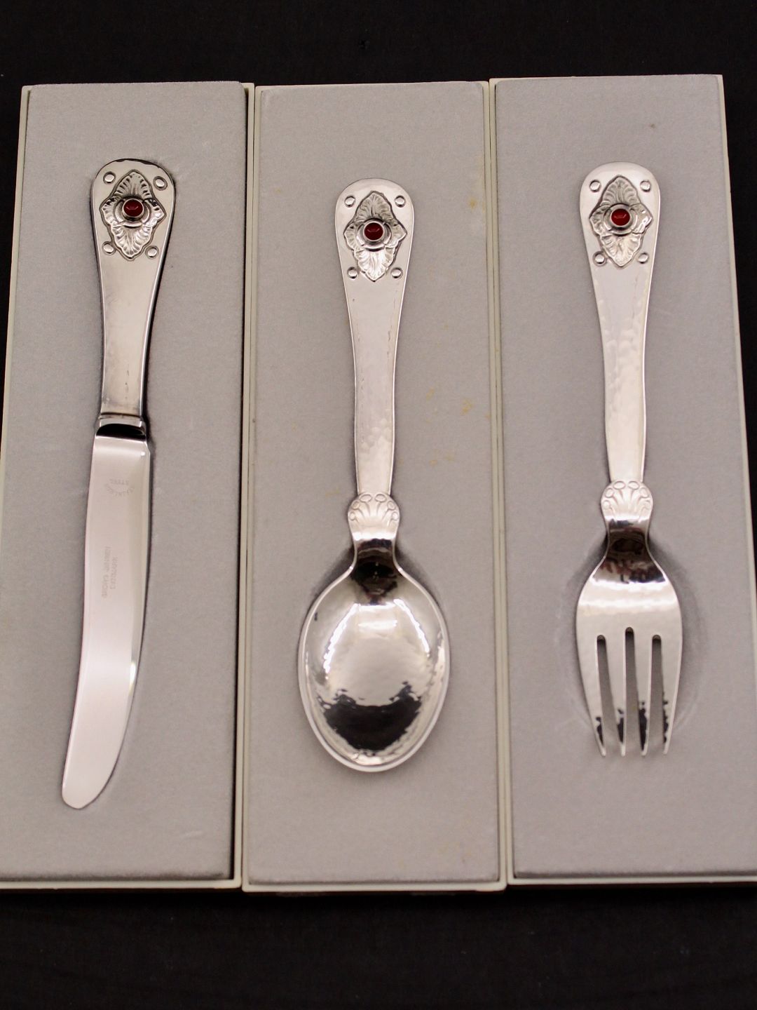 GEORG JENSEN sæt jubilæums barne bestik sterling sølv med carneol ubrugt som nyt emne nr. 600242