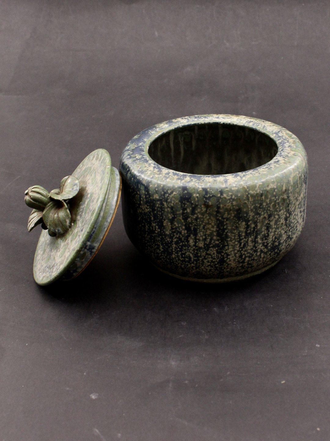 Arne Bang låg krukke med grønlig glasur højde uden låg 8,5 cm. design 29 emne nr. 607523