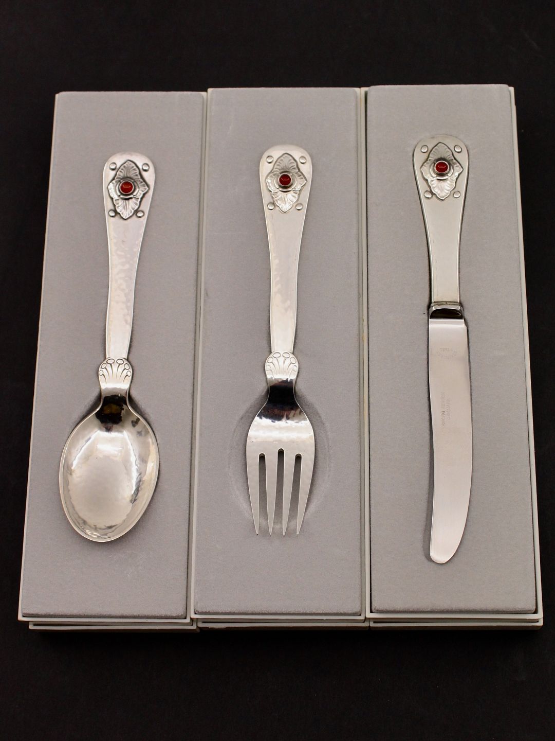 Georg Jensen jubilæums barne bestik sterling sølv med karneol flot som nyt i originale æsker emne nr. 607705