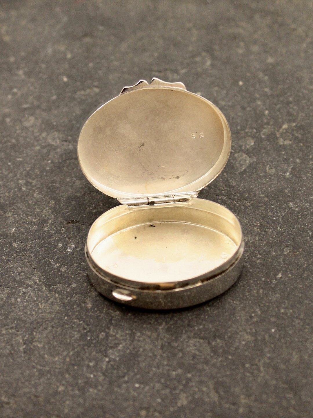 Sølv pille æske 3,6 x 3 cm. stemplet 0,800 emne nr. 613760