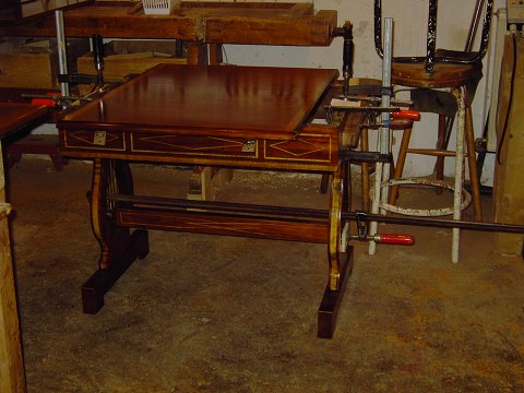 Lyrebord i mahogni. Gennemgribende restaurering. På fotoet ses at messingstrengene er skiftet.