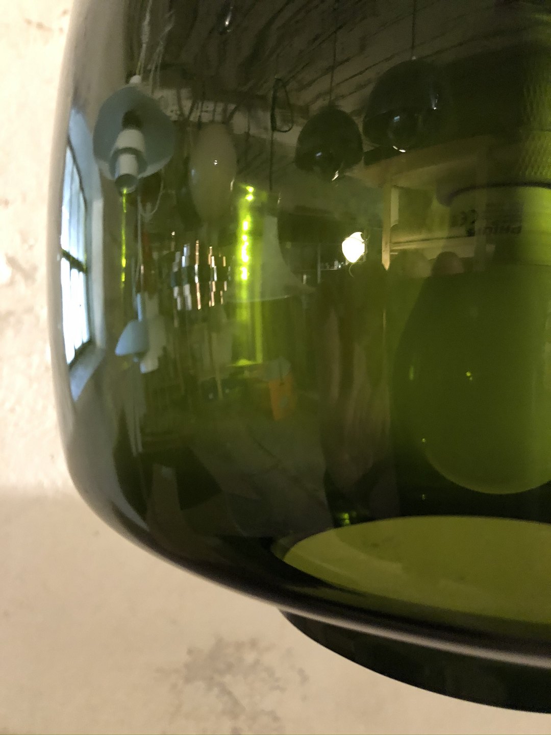 Large green glass lamp from the 1960s. Really fine condition except very small scratch on bottom edge - see photo. Height 35 cm, diameter 28 cm.