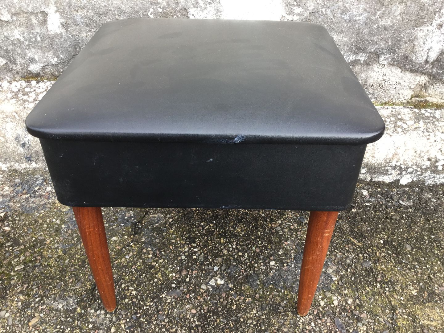 Sewing box in black artificial leather with massive teakben. Danish modern from the 1960s. Nice used condition. Dimensions: HxLxW 37x38x38 cm.
